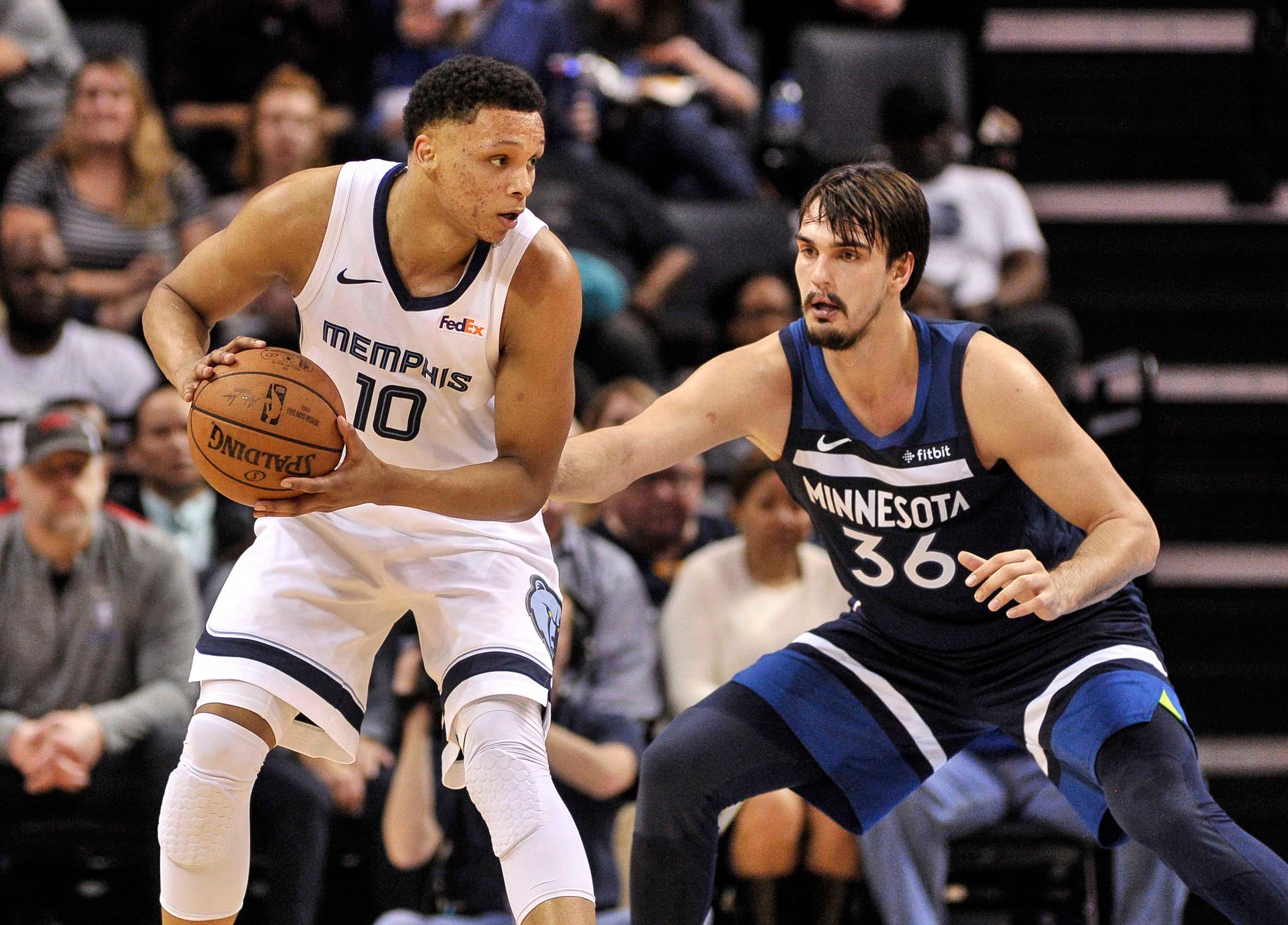 Feb 5, 2019; Memphis, TN, USA; Memphis Grizzlies forward Ivan Rabb (10) handles the ball against Minnesota Timberwolves forward Dario Saric (36) during the first half at FedExForum. Mandatory Credit: Justin Ford-USA TODAY Sports / Justin Ford