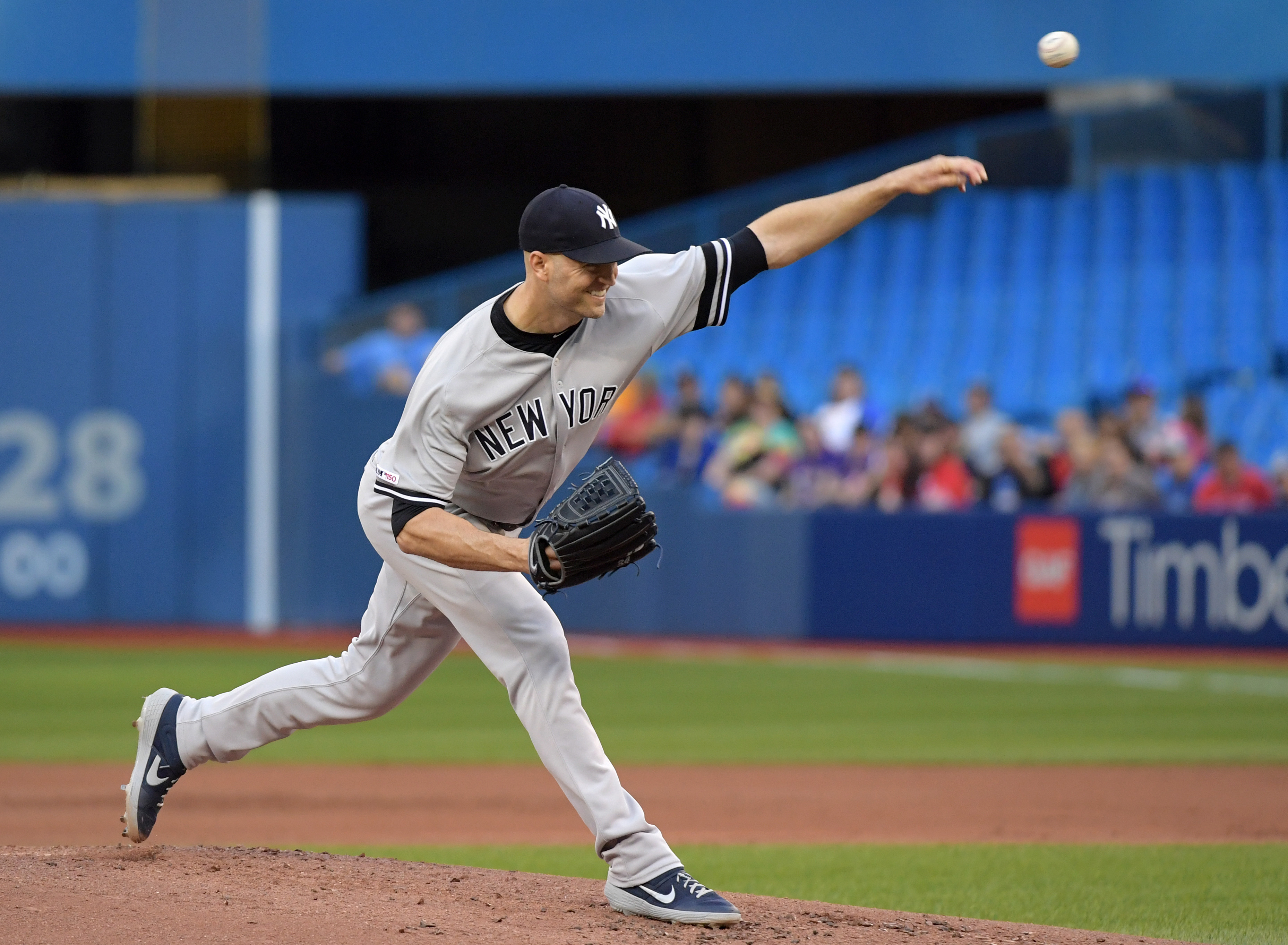 Jun 6, 2019; Toronto, Ontario, CAN; New York Yankees starting pitcher J.A. Happ (34) delivers a pitch against Toronto Blue Jays in the first inning at Rogers Centre. Mandatory Credit: Dan Hamilton-USA TODAY Sports / Dan Hamilton