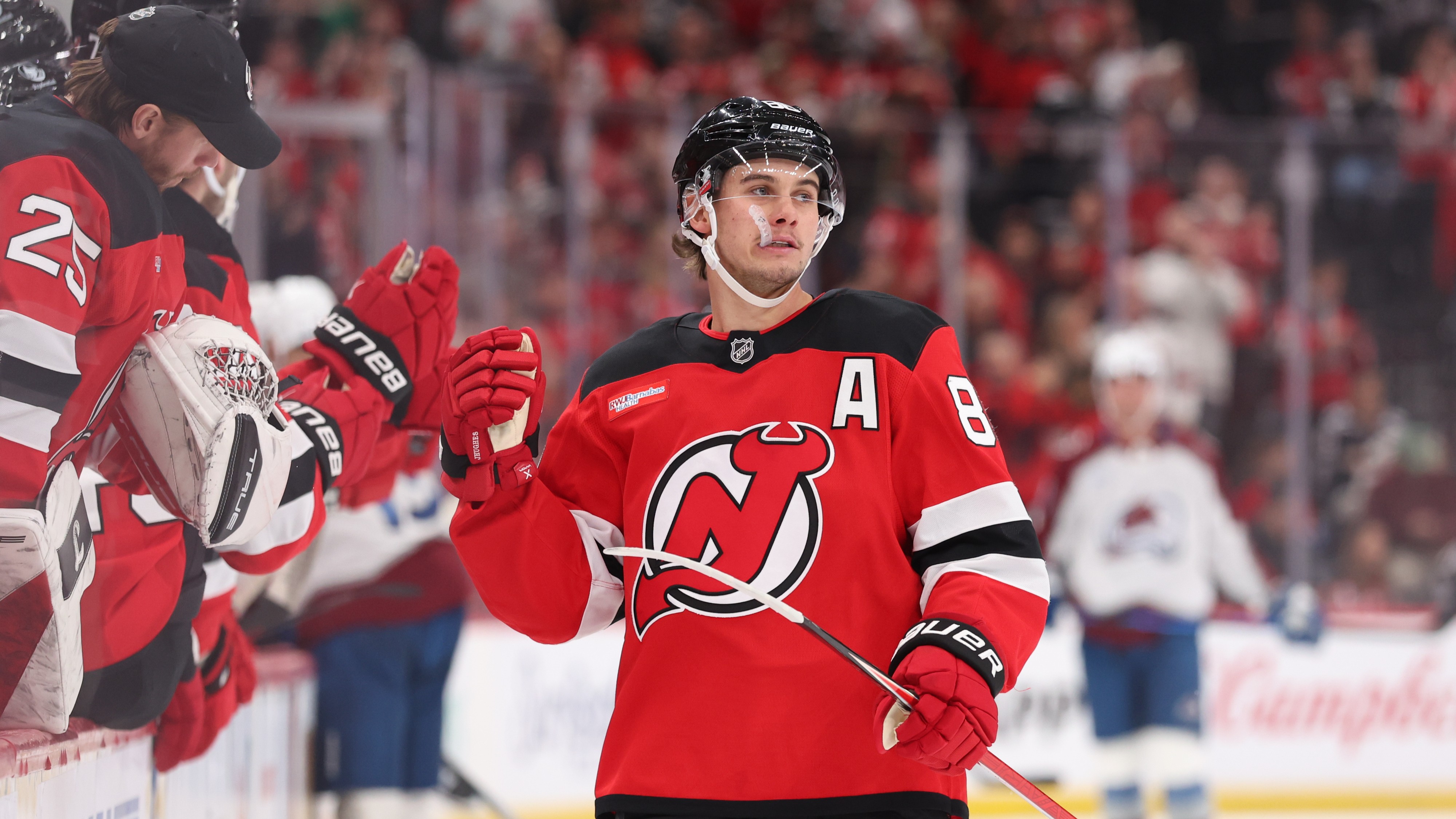 Jack Hughes scores game-winning goal in OT, Devils' win streak stays alive with 4-3 victory over AvalancheNew Jersey has now won eight in a row10/26/2025, 8:14 PMAssociated PressOct 26, 2025; Newark, New Jersey, USA; New Jersey Devils center Jack Hughes (86) celebrates his goal against the Colorado Avalanche during the first period at Prudential Center. Mandatory Credit: Ed Mulholland-Imagn Images / © Ed Mulholland-Imagn Images