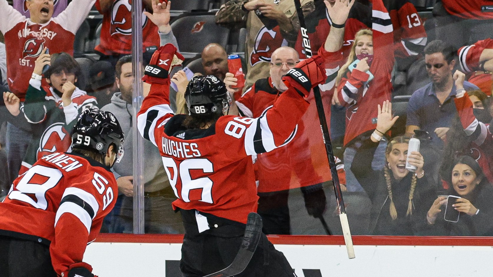 Oct 15, 2021; Newark, New Jersey, USA; New Jersey Devils center Jack Hughes (86) celebrates his goal with center Janne Kuokkanen (59) during the second period against the Chicago Blackhawks at Prudential Center. Mandatory Credit: Vincent Carchietta-USA TODAY Sports / Vincent Carchietta-USA TODAY Sports