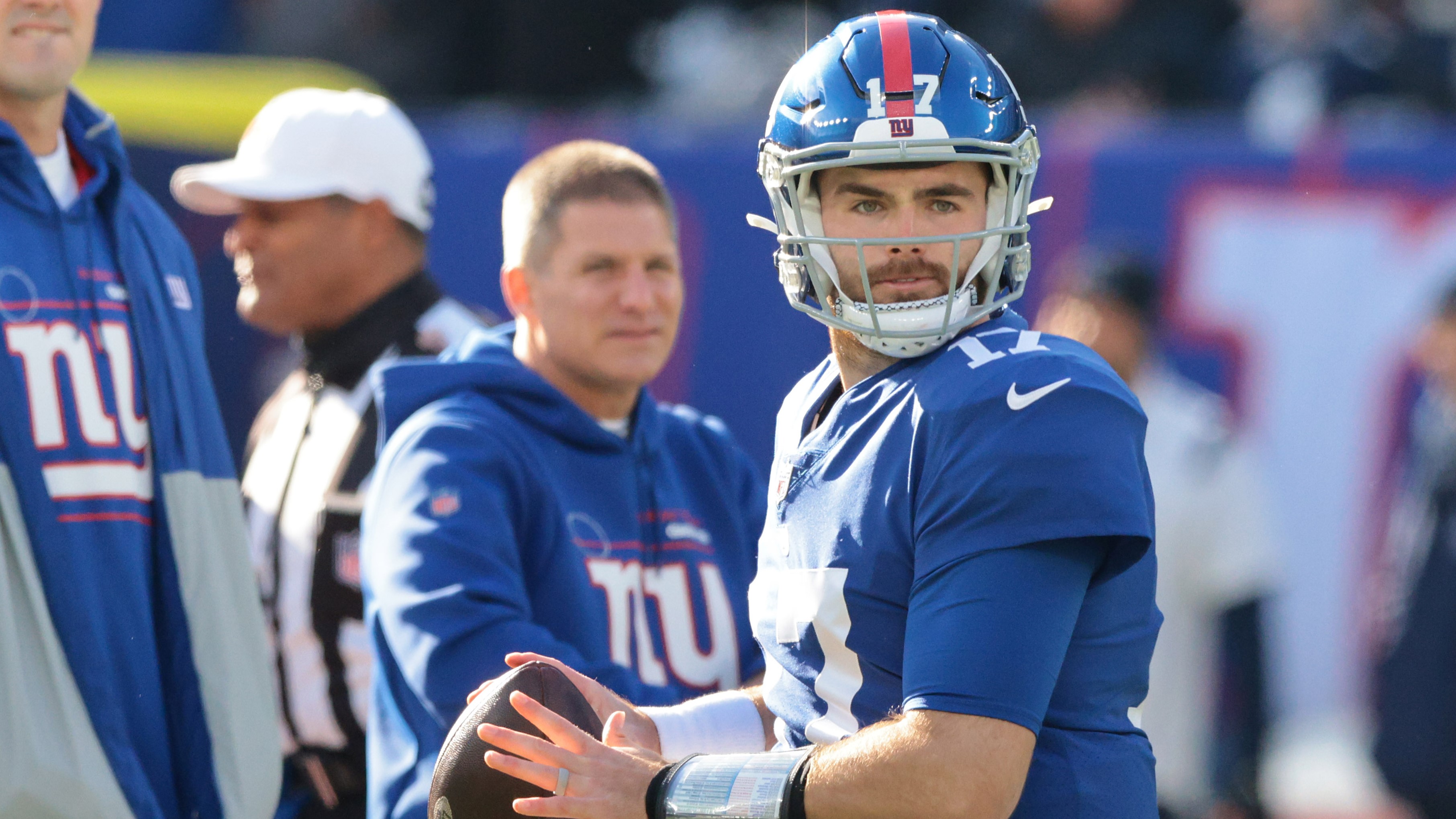 Dec 19, 2021; East Rutherford, New Jersey, USA; New York Giants quarterback Jake Fromm (17) throws the ball as quarterback Daniel Jones (8) looks on before the game against the Dallas Cowboys at MetLife Stadium. Mandatory Credit: Vincent Carchietta-USA TODAY Sports / Vincent Carchietta-USA TODAY Sports