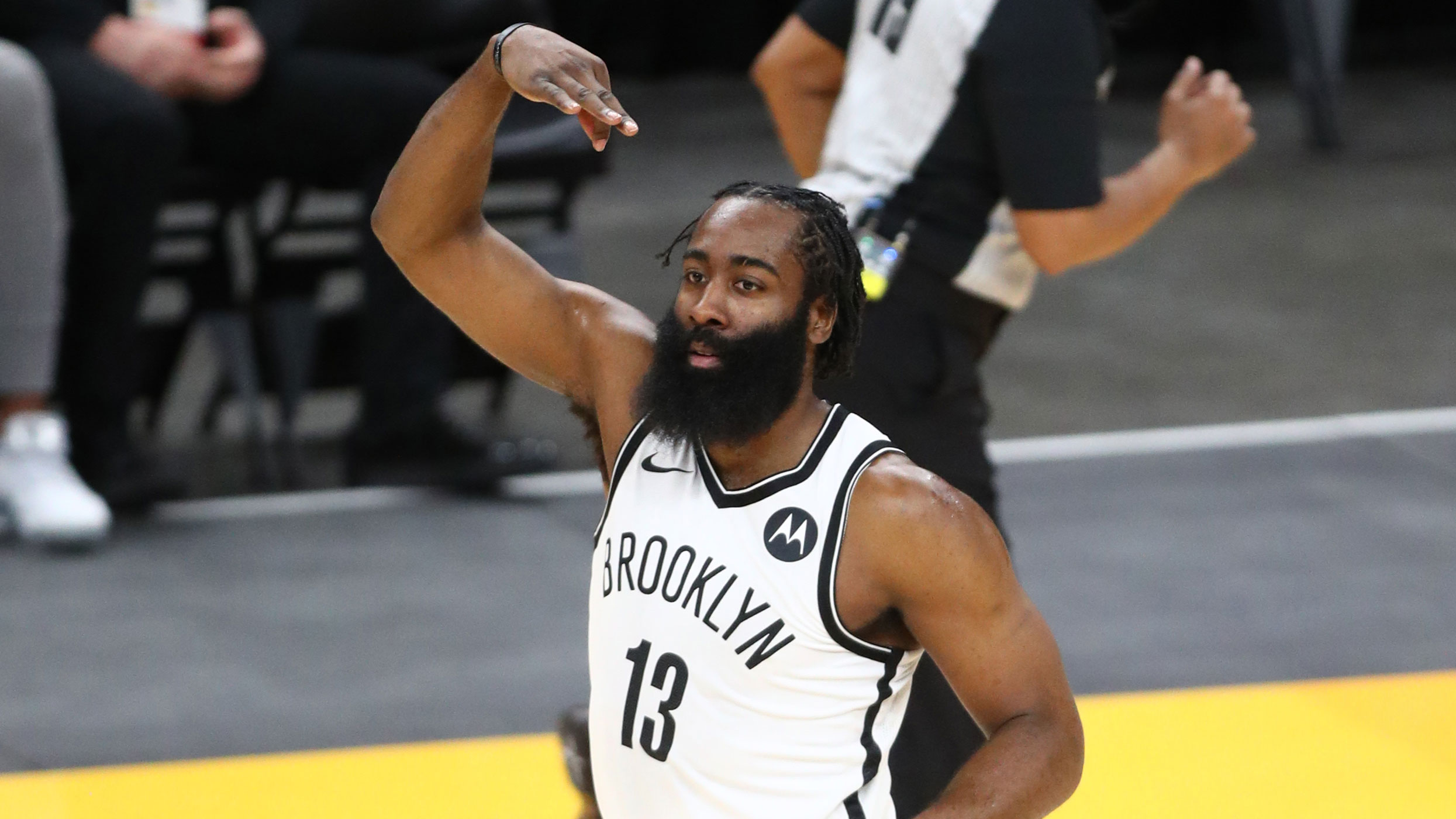 Feb 16, 2021; Phoenix, Arizona, USA; Brooklyn Nets guard James Harden (13) celebrates three pointer against the Phoenix Suns in the first half at Phoenix Suns Arena. / Mark J. Rebilas-USA TODAY Sports