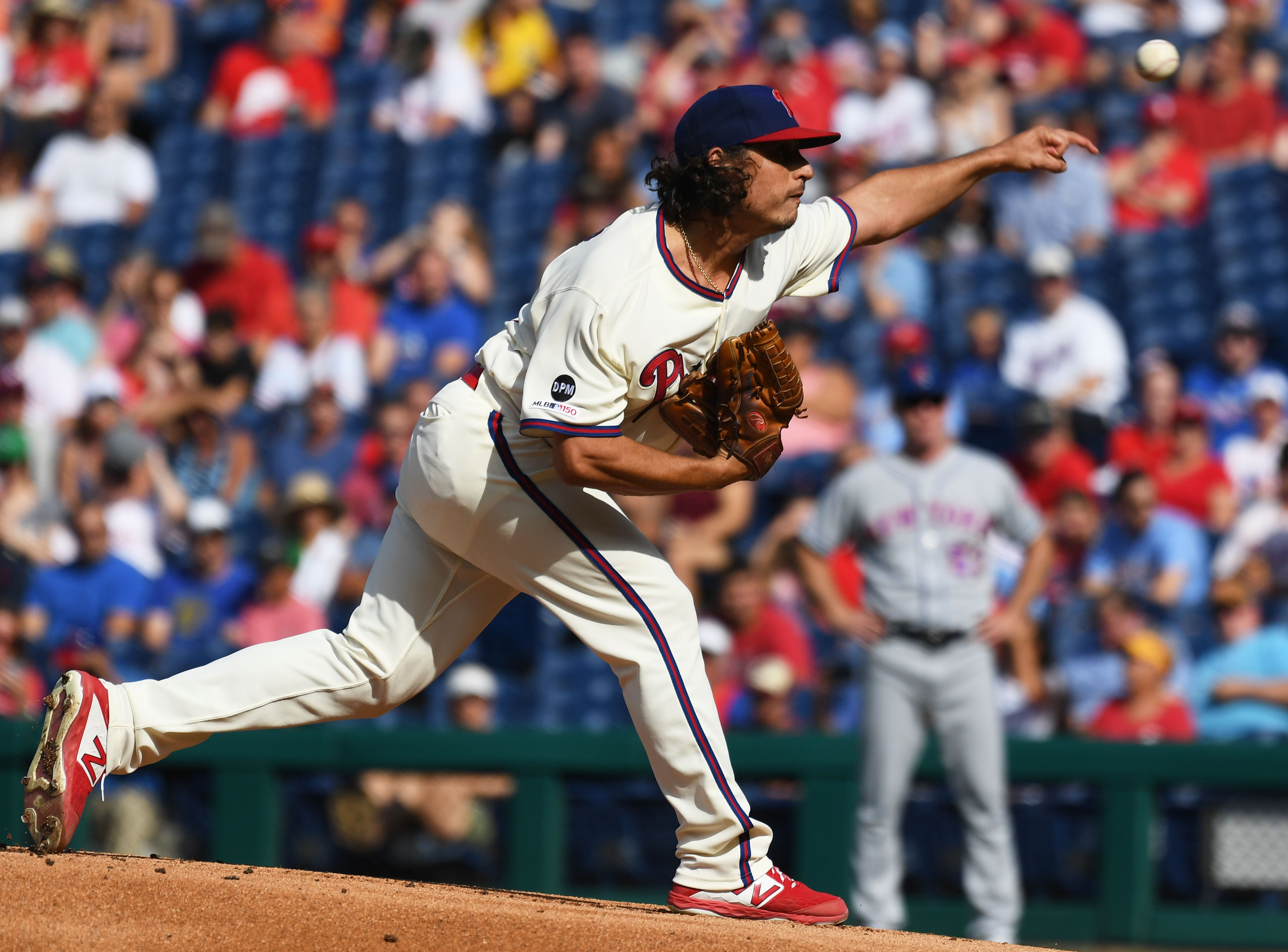 Aug 31, 2019; Philadelphia, PA, USA; Philadelphia Phillies starting pitcher Jason Vargas (44) pitches in the first inning against the New York Mets at Citizens Bank Park. Mandatory Credit: James Lang-USA TODAY Sports / James Lang