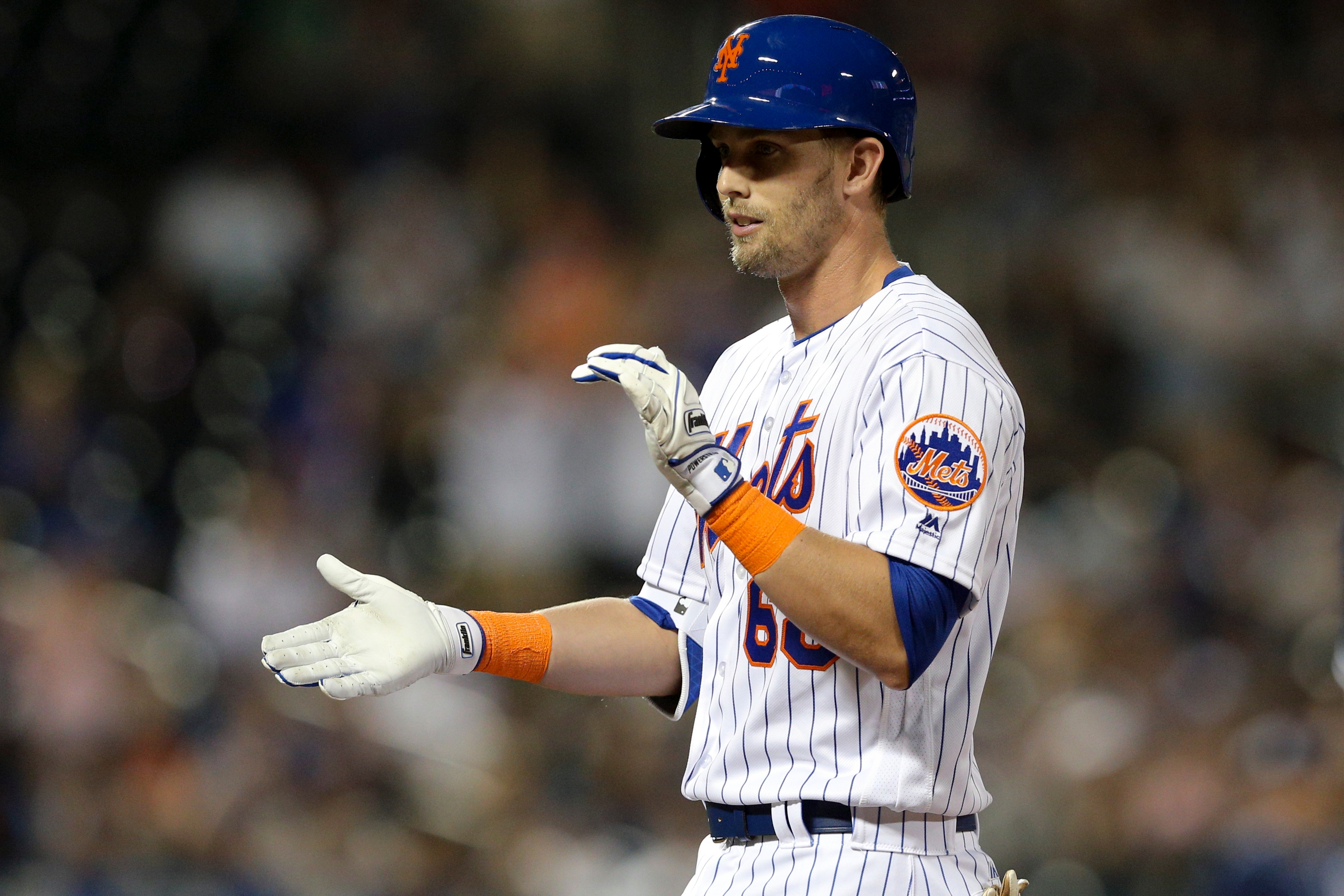 Jul 24, 2018; New York City, NY, USA; New York Mets pinch hitter Jeff McNeil (68) reacts after hitting a single against the San Diego Padres during the ninth inning at Citi Field. The hit was his first major league hit. Mandatory Credit: Brad Penner-USA TODAY Sports / Brad Penner