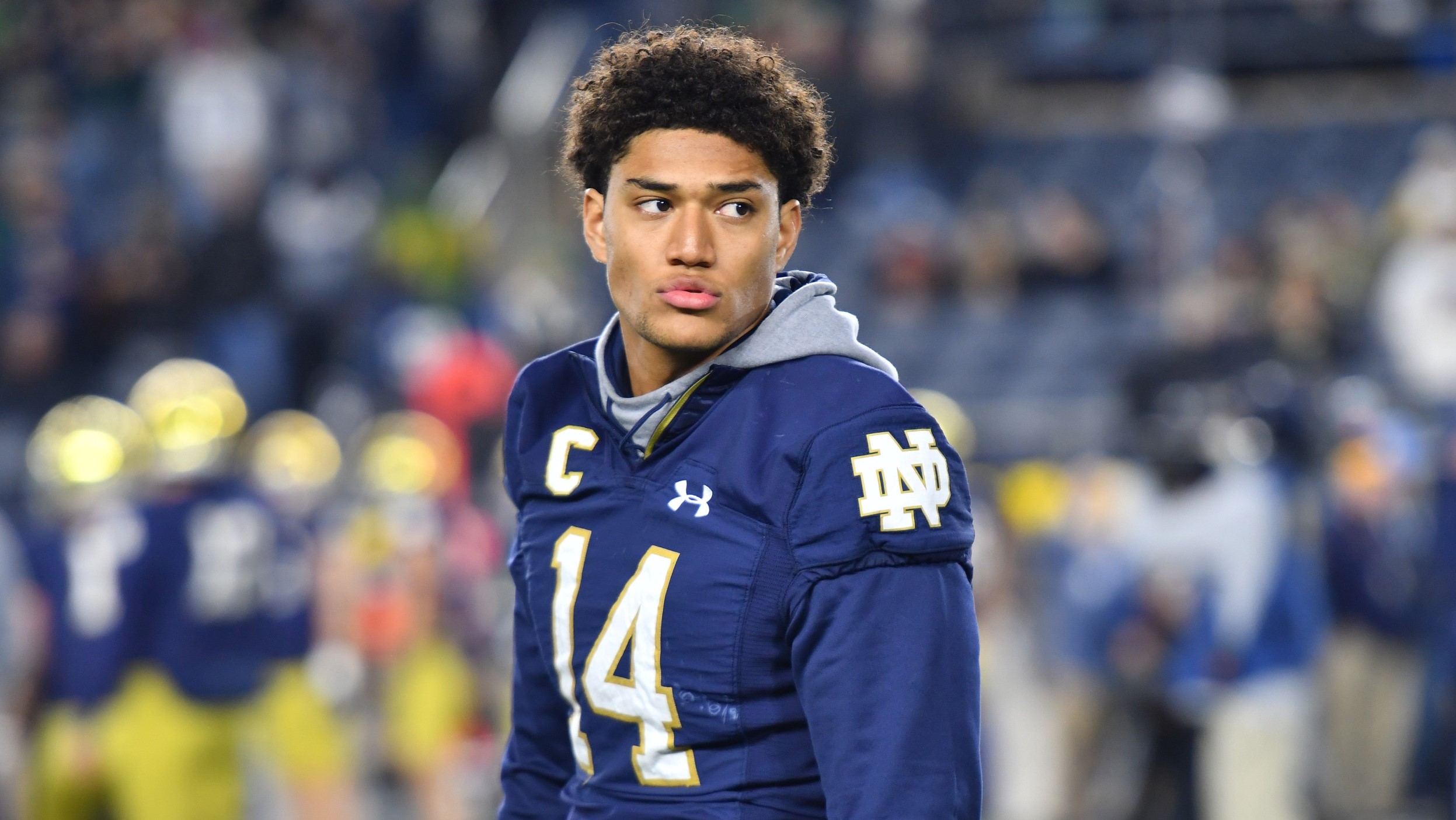 Oct 30, 2021; South Bend, Indiana, USA; Notre Dame Fighting Irish safety Kyle Hamilton (14) watches warm ups before the game against the North Carolina Tar Heels at Notre Dame Stadium. / Matt Cashore-USA TODAY Sports