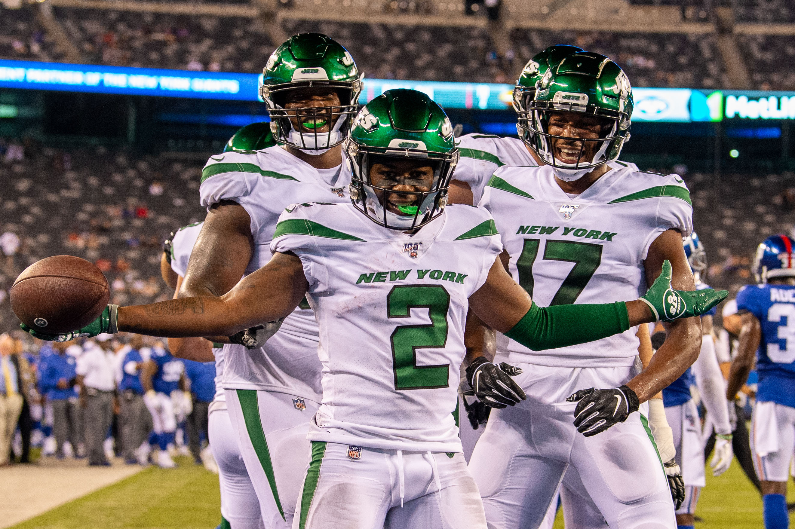 Aug 8, 2019; East Rutherford, NJ, USA; New York Jets wide receiver Greg Dortch (2) celebrates his touchdown against the New York Giants during the second half at MetLife Stadium. / Dennis Schneidler/USA TODAY Sports