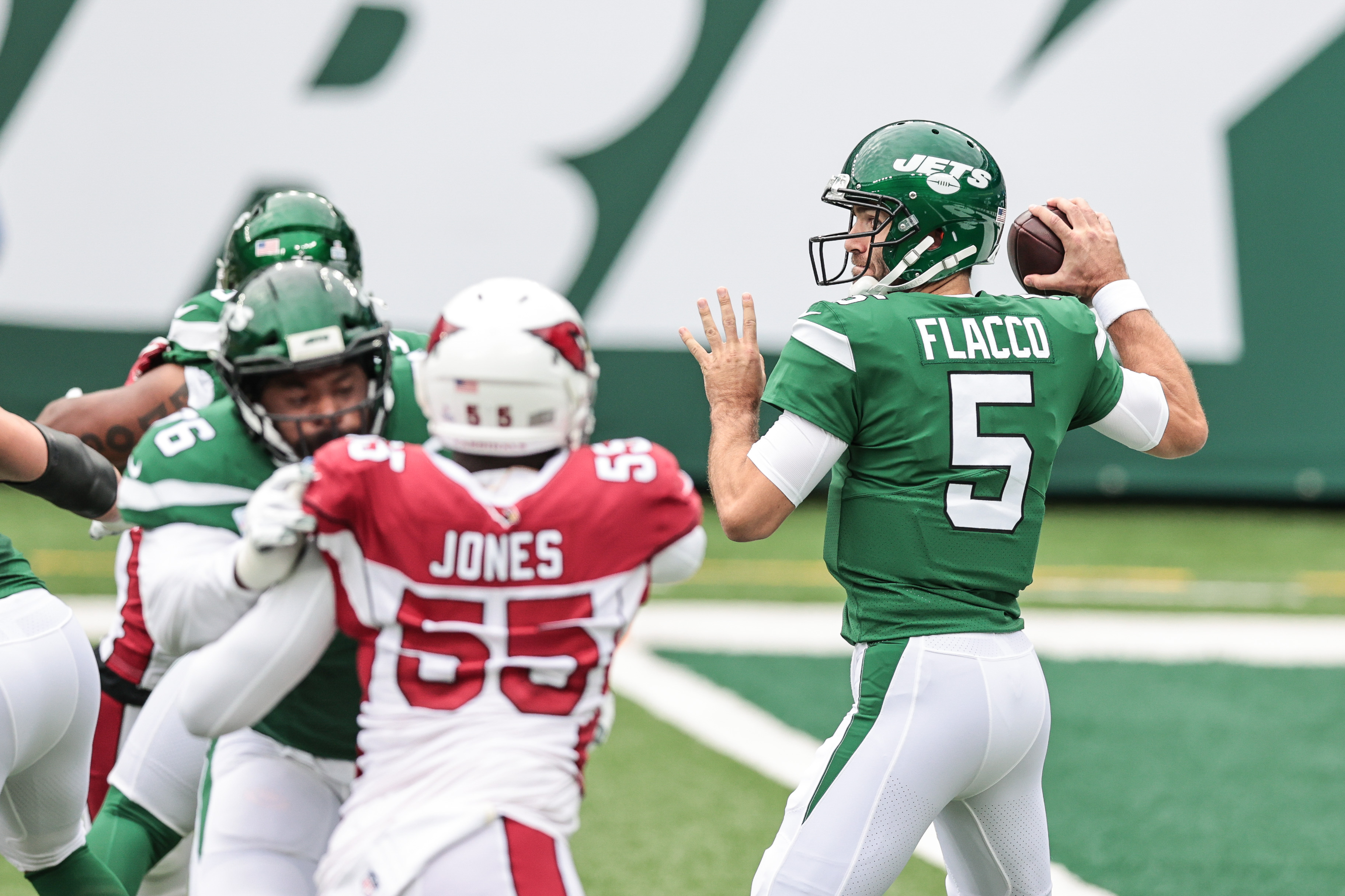 Jets acquire Joe Flacco from EaglesMike White was slated to start in place of Zach Wilson10/25/2021, 10:15 PMRyan MorikFreelance Editorial ProducerOct 11, 2020; East Rutherford, New Jersey, USA; New York Jets quarterback Joe Flacco (5) throws the ball as Arizona Cardinals linebacker Chandler Jones (55) rushes during the first half at MetLife Stadium. Mandatory Credit: Vincent Carchietta-USA TODAY Sports / © Vincent Carchietta-USA TODAY Sports