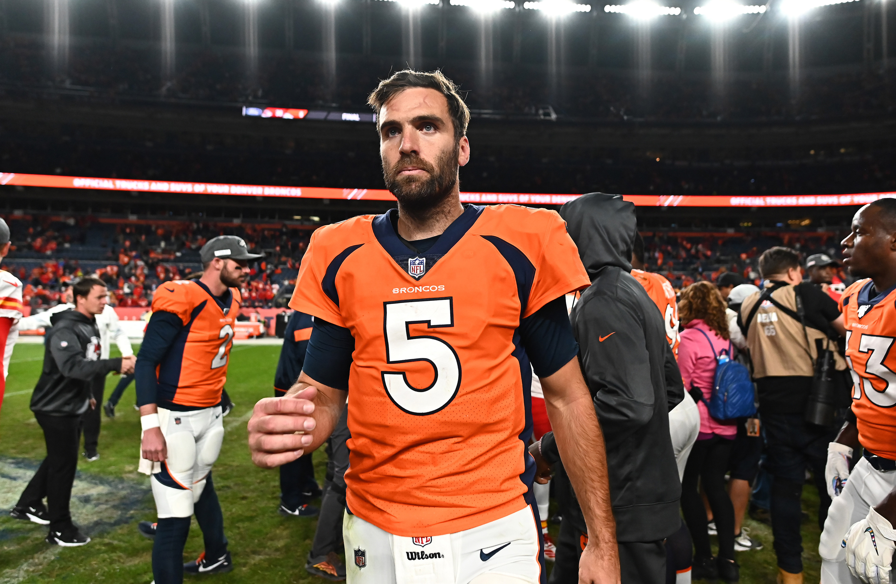 Oct 17, 2019; Denver, CO, USA; Denver Broncos quarterback Joe Flacco (5) leaves the field following the loss to the Kansas City Chiefs at Empower Field at Mile High. / Ron Chenoy/USA TODAY Sports