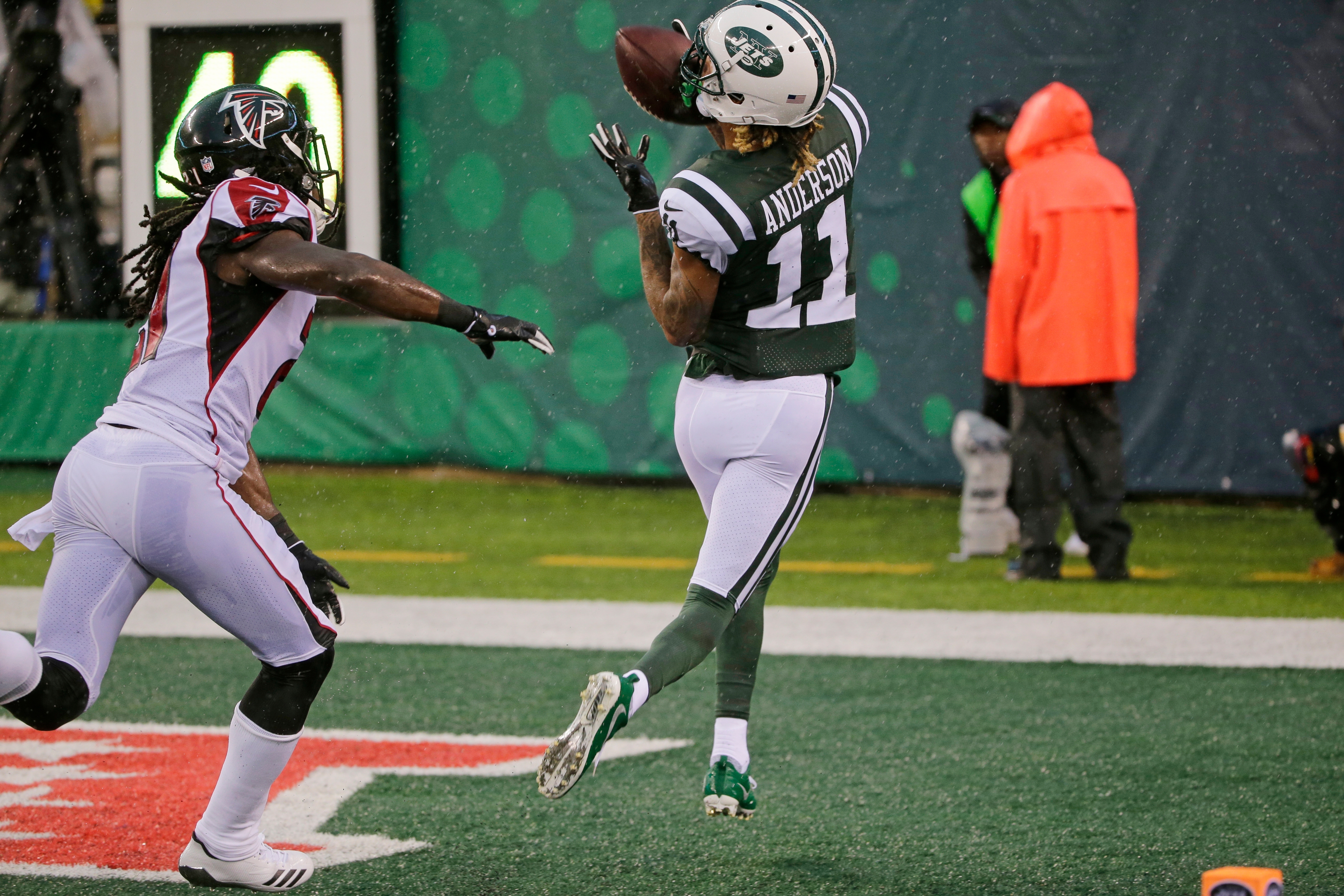 New York Jets wide receiver Robby Anderson (11) catches a pass for a touchdown in front of Atlanta Falcons' Sharrod Neasman (20) during the first half of an NFL football game Sunday, Oct. 29, 2017, in East Rutherford, N.J. (AP Photo/Seth Wenig) / Seth Wenig/AP