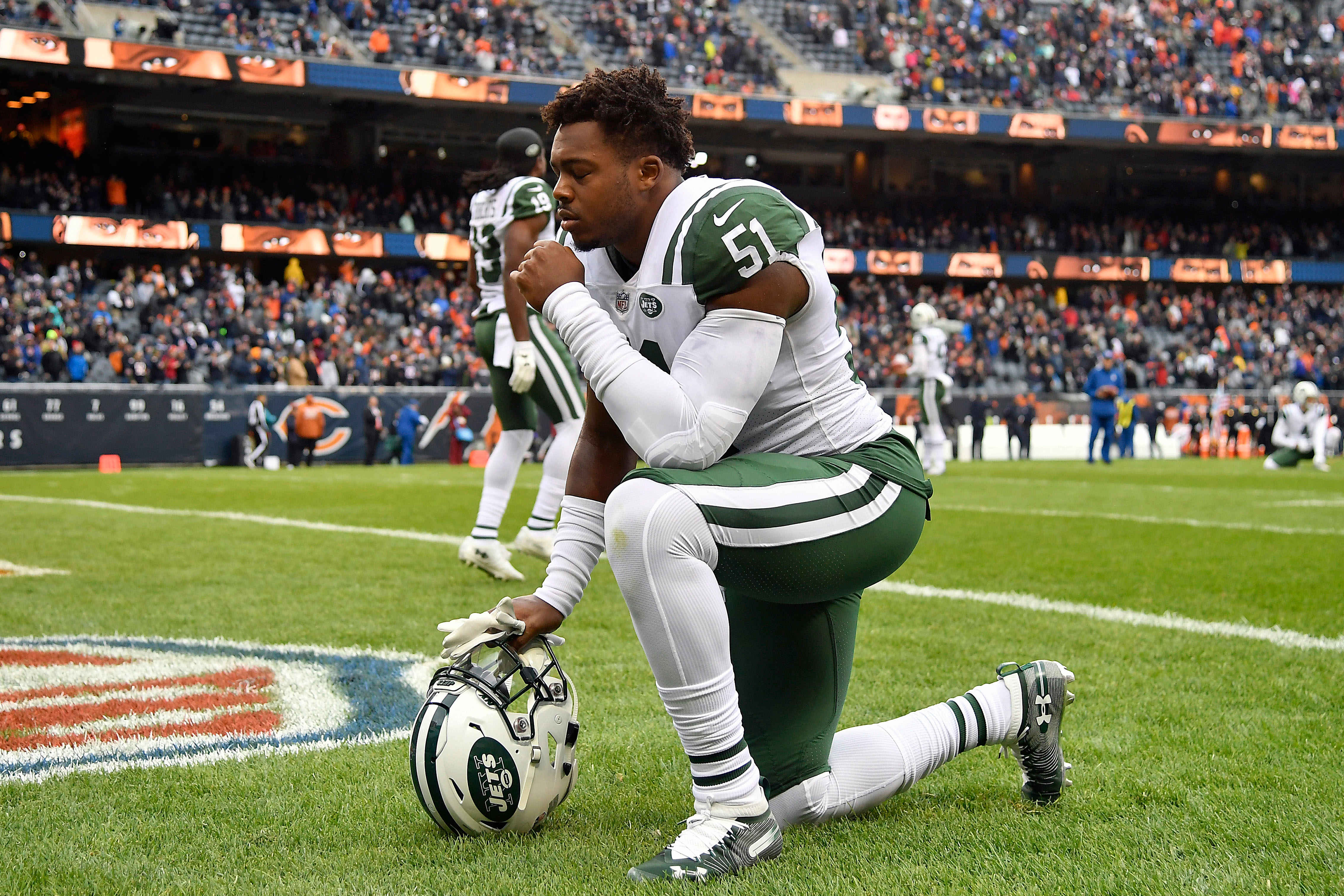 Oct 28, 2018; Chicago, IL, USA; New York Jets outside linebacker Brandon Copeland (51) takes a knee moments before the game against the Chicago Bears at Soldier Field. Mandatory Credit: Quinn Harris-USA TODAY Sports / Quinn Harris