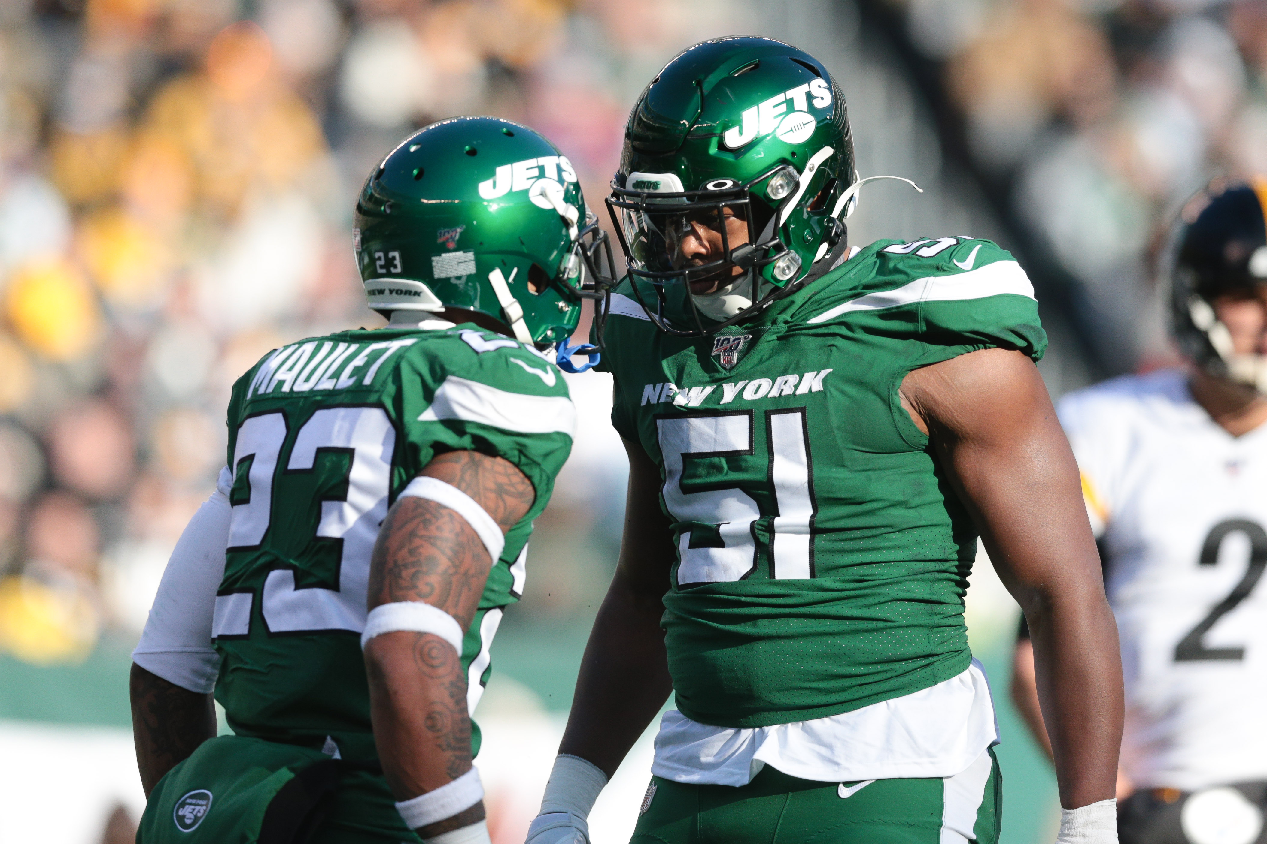 Dec 22, 2019; East Rutherford, New Jersey, USA; New York Jets outside linebacker Brandon Copeland (51) celebrates after a sack with New York Jets cornerback Arthur Maulet (23) during the first half at MetLife Stadium. Mandatory Credit: Vincent Carchietta-USA TODAY Sports / Vincent Carchietta