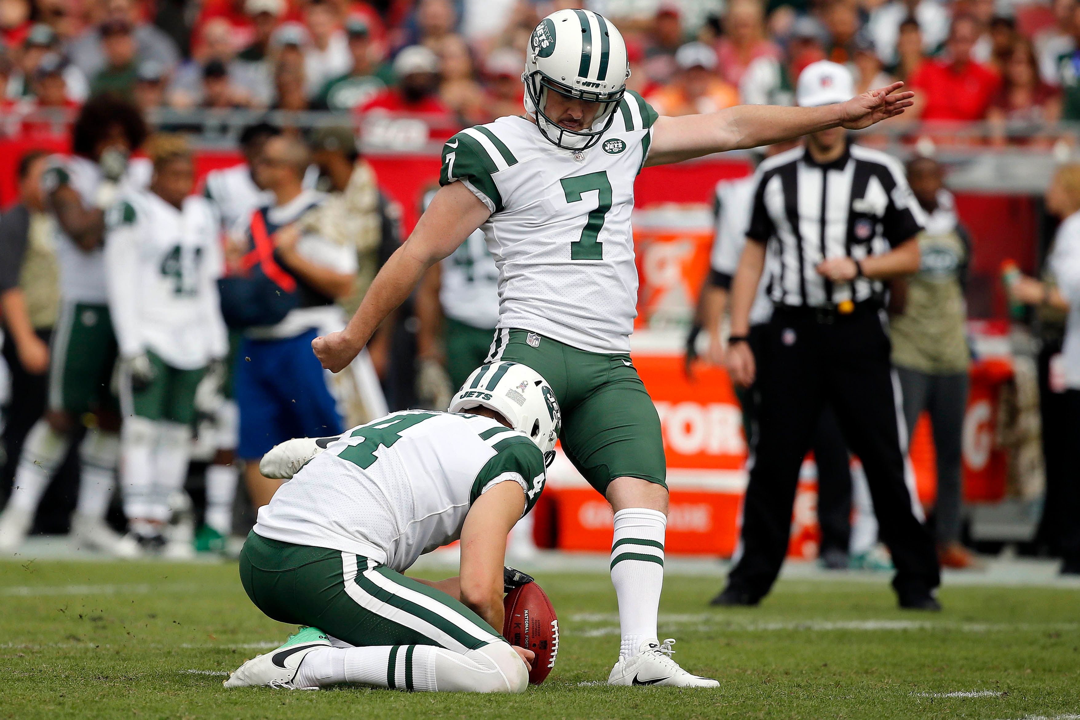 New York Jets kicker Chandler Catanzaro makes a field goal as punter Lac Edwards holds the ball during the first half at Raymond James Stadium. / Kim Klement/USA TODAY Sports