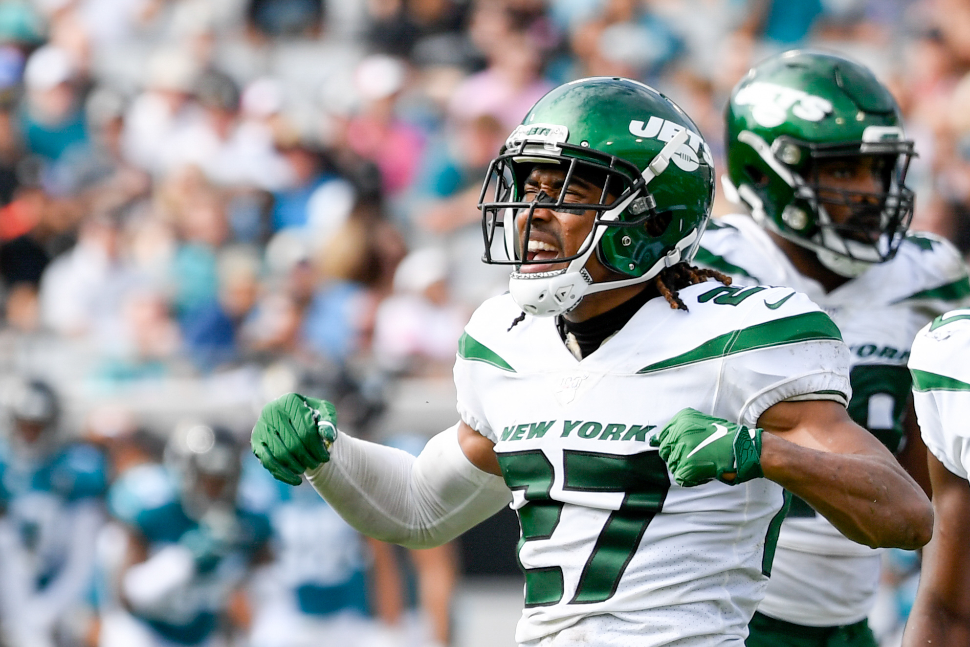 Oct 27, 2019; Jacksonville, FL, USA; New York Jets cornerback Darryl Roberts (27) reacts during the fourth quarter against the Jacksonville Jaguars at TIAA Bank Field. Mandatory Credit: Douglas DeFelice-USA TODAY Sports / Douglas DeFelice