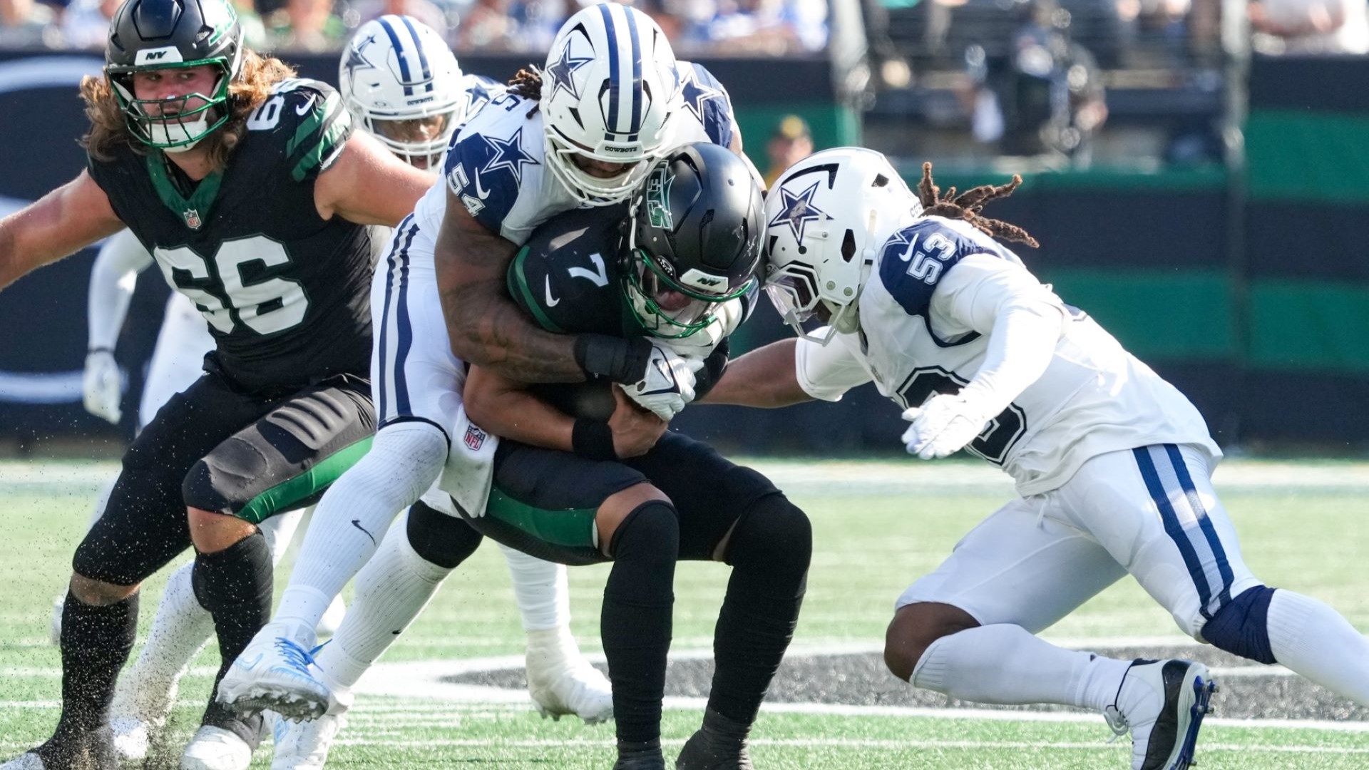 Jets give up 30 unanswered points in 37-22 loss to Cowboys, fall to 0-5Defense allowed Dak Prescott to throw for four TDs, Javonte Williams to run for 135 yards10/5/2025, 8:30 PMLucas HutchersonNFL freelance writer
