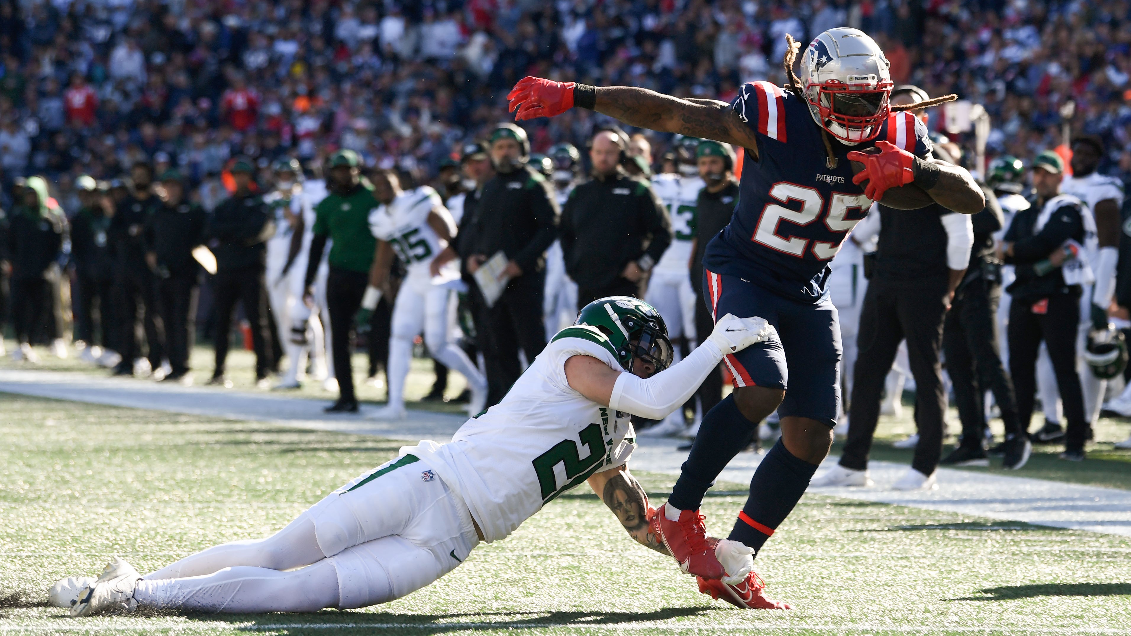 Oct 24, 2021; Foxborough, Massachusetts, USA; New York Jets safety Ashtyn Davis (21) takes New England Patriots running back Brandon Bolden (25) during the first half at Gillette Stadium. Mandatory Credit: Brian Fluharty-USA TODAY Sports / Brian Fluharty-USA TODAY Sports
