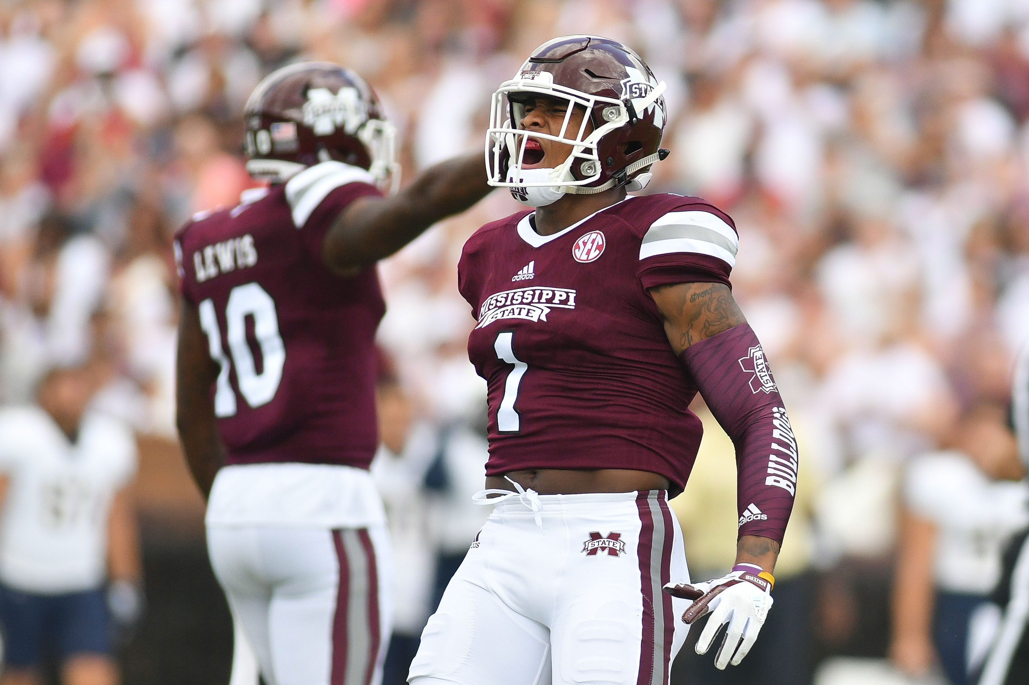 Sep 2, 2017; Starkville, MS, USA; Mississippi State Bulldogs defensive back Brandon Bryant (1) reacts during the game against the Charleston Southern Buccaneers at Davis Wade Stadium. Mandatory Credit: Matt Bush-USA TODAY Sports / Matt Bush