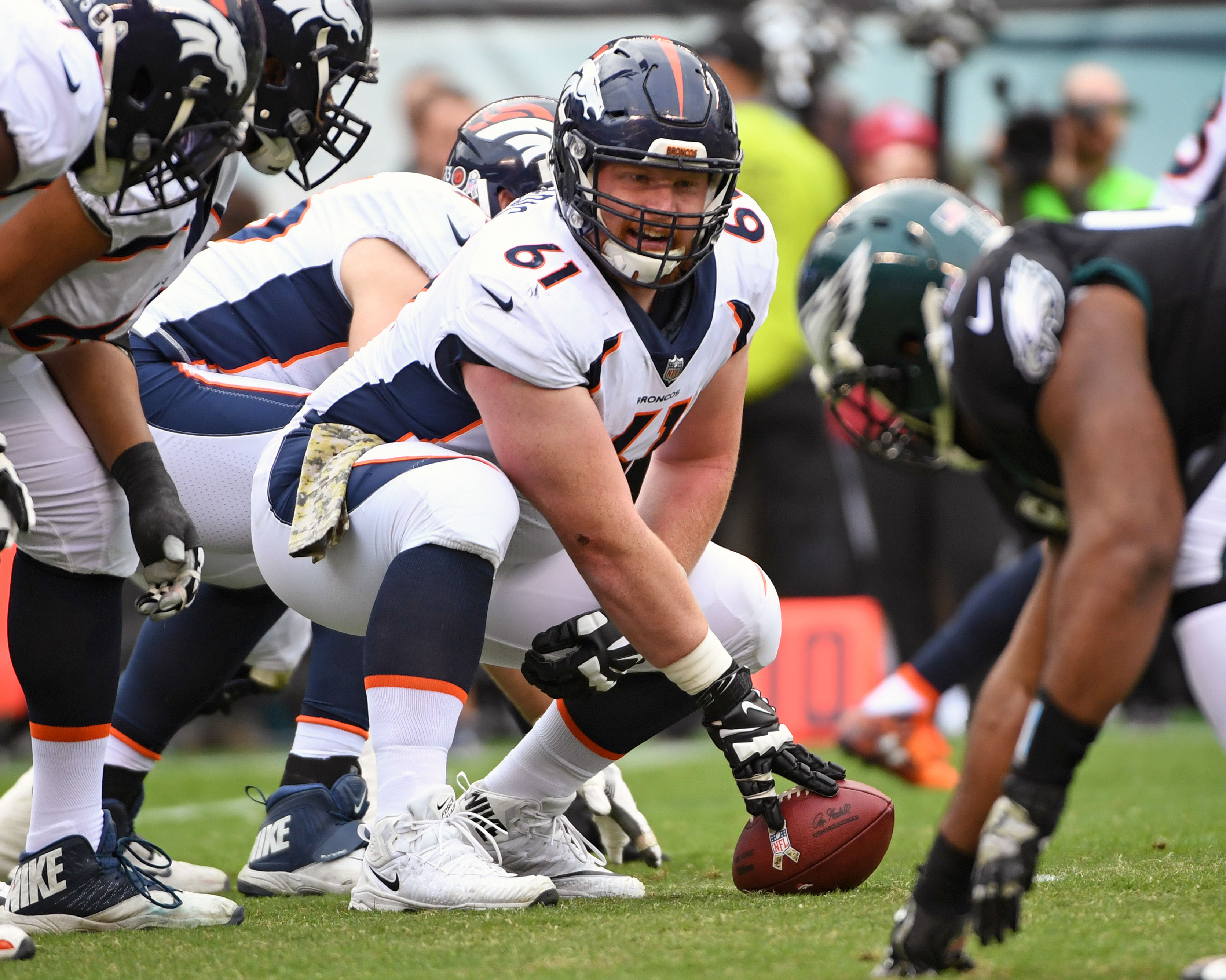 Nov 5, 2017; Philadelphia, PA, USA; Denver Broncos center Matt Paradis (61) calls a signal against the Philadelphia Eagles at Lincoln Financial Field. Mandatory Credit: Eric Hartline-USA TODAY Sports / Eric Hartline