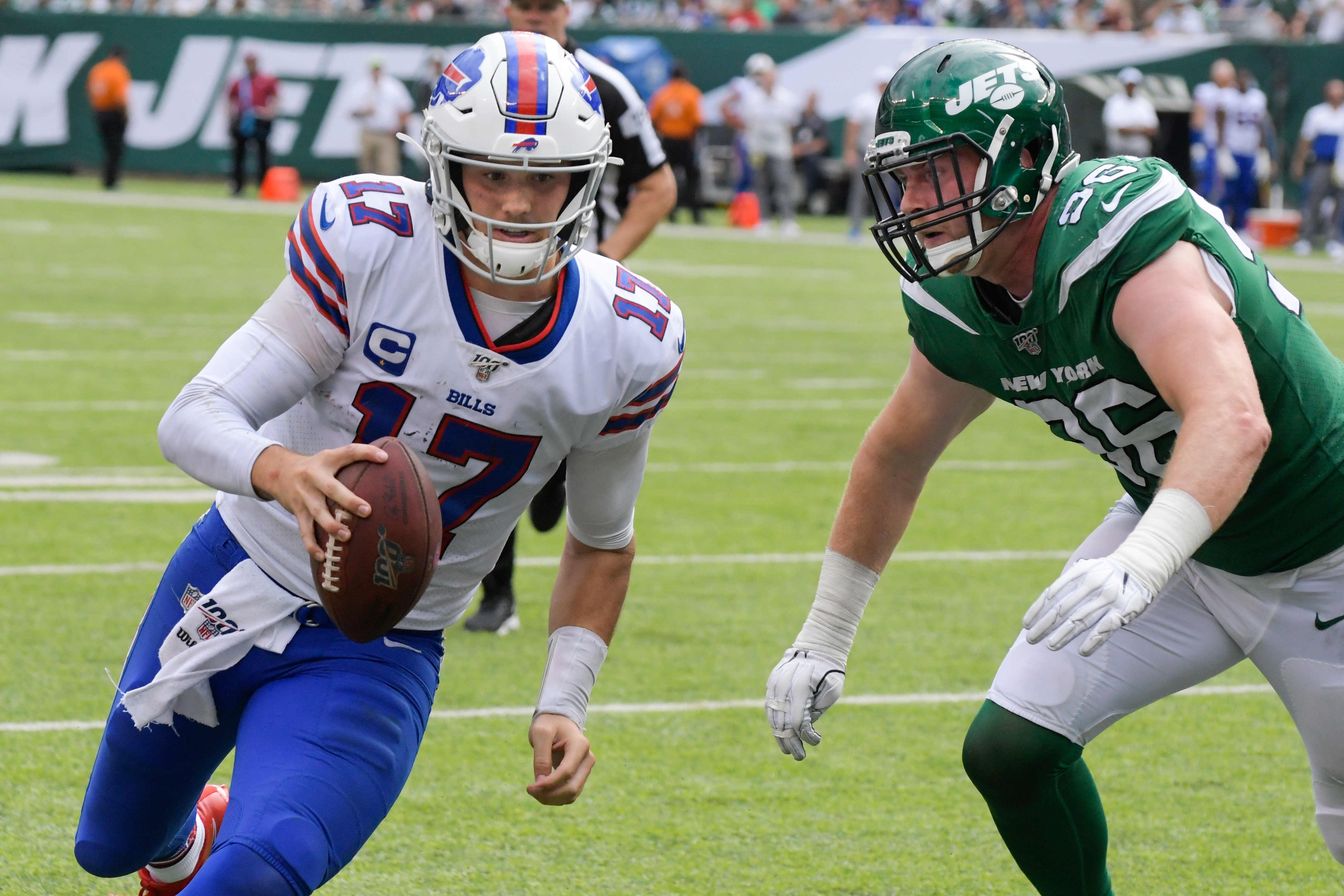 Buffalo Bills' Josh Allen (17) runs past New York Jets' Henry Anderson (96) for a touchdown during the second half of an NFL football game Sunday, Sept. 8, 2019, in East Rutherford, N.J. (AP Photo/Bill Kostroun) / Bill Kostroun/AP