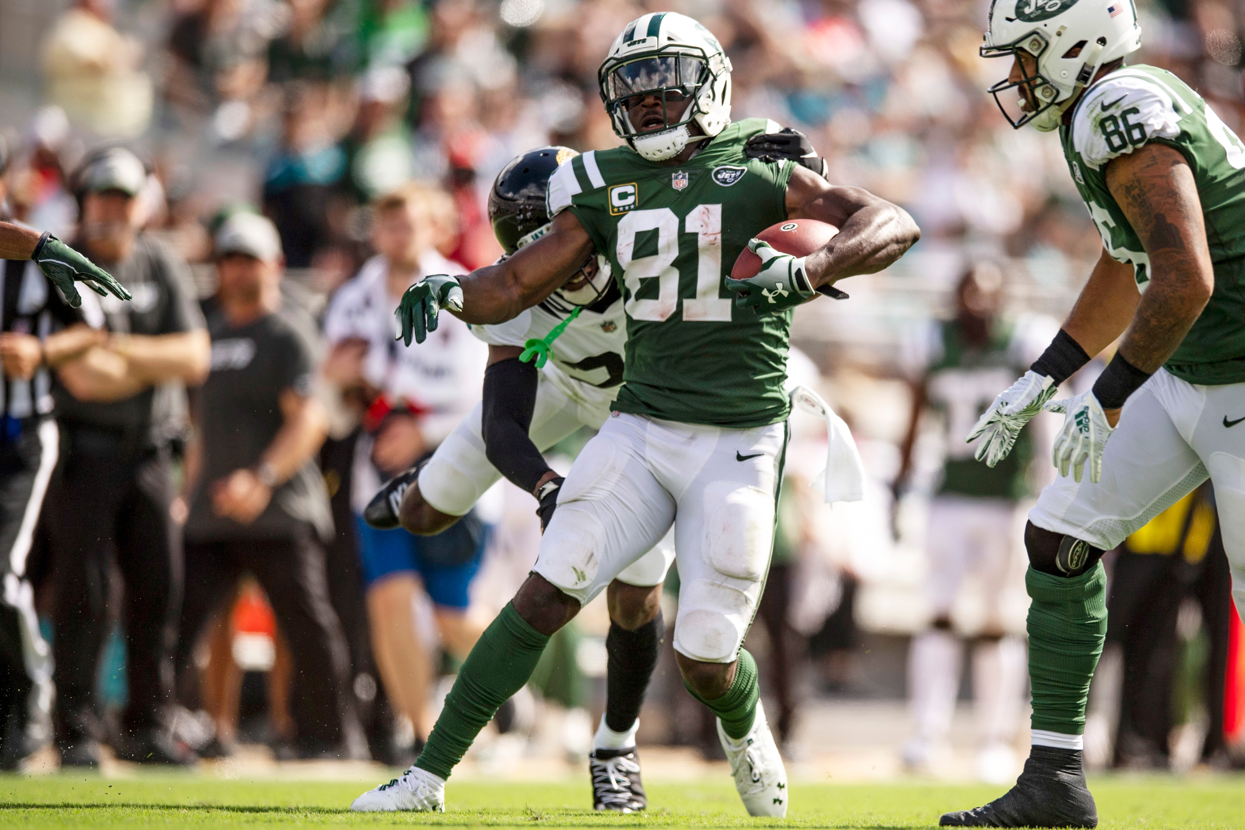 Sep 30, 2018; Jacksonville, FL, USA; New York Jets wide receiver Quincy Enunwa (81) runs with the ball against Jacksonville Jaguars corner back Jalen Ramsey (20) during the second half at TIAA Bank Field. Mandatory Credit: Douglas DeFelice-USA TODAY Sports / Douglas DeFelice