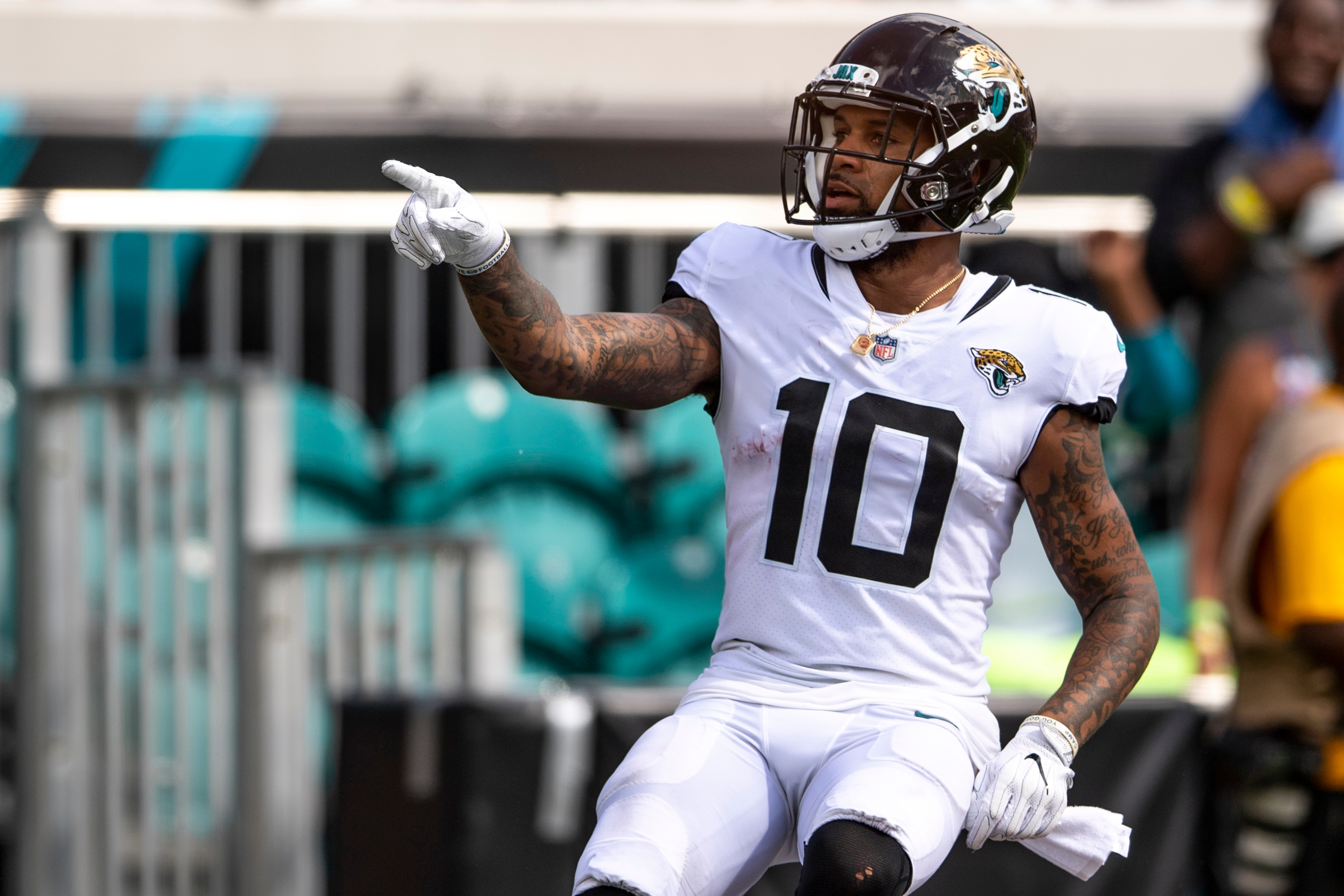 Sep 30, 2018; Jacksonville, FL, USA; Jacksonville Jaguars wide receiver Donte Moncrief (10) celebrates after scoring a touchdown against the New York Jets during the second half at TIAA Bank Field. Mandatory Credit: Douglas DeFelice-USA TODAY Sports / Douglas DeFelice