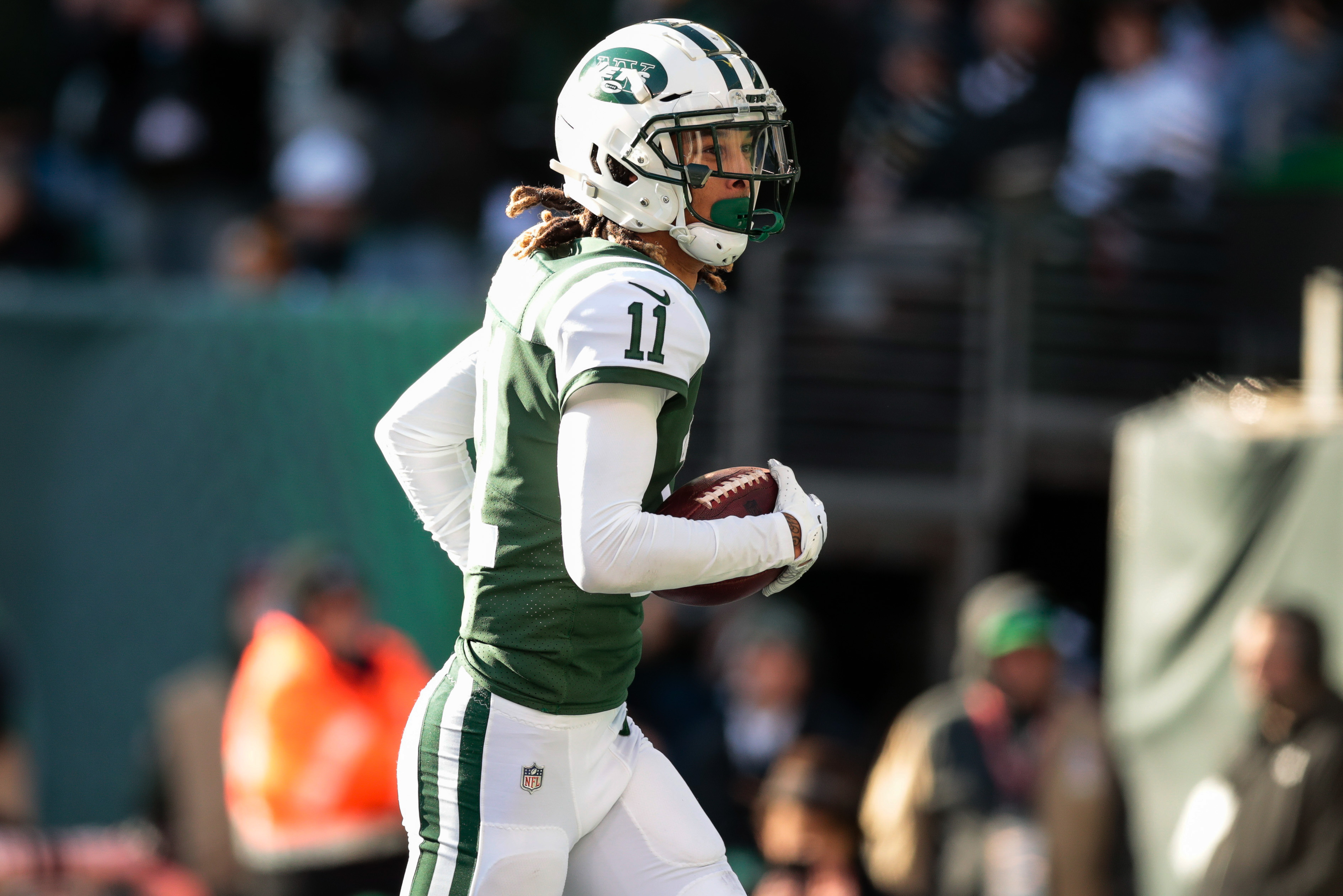 Dec 23, 2018; East Rutherford, NJ, USA; New York Jets wide receiver Robby Anderson (11) scores a touchdown during the first half against the Green Bay Packers at MetLife Stadium. Mandatory Credit: Vincent Carchietta-USA TODAY Sports / Vincent Carchietta