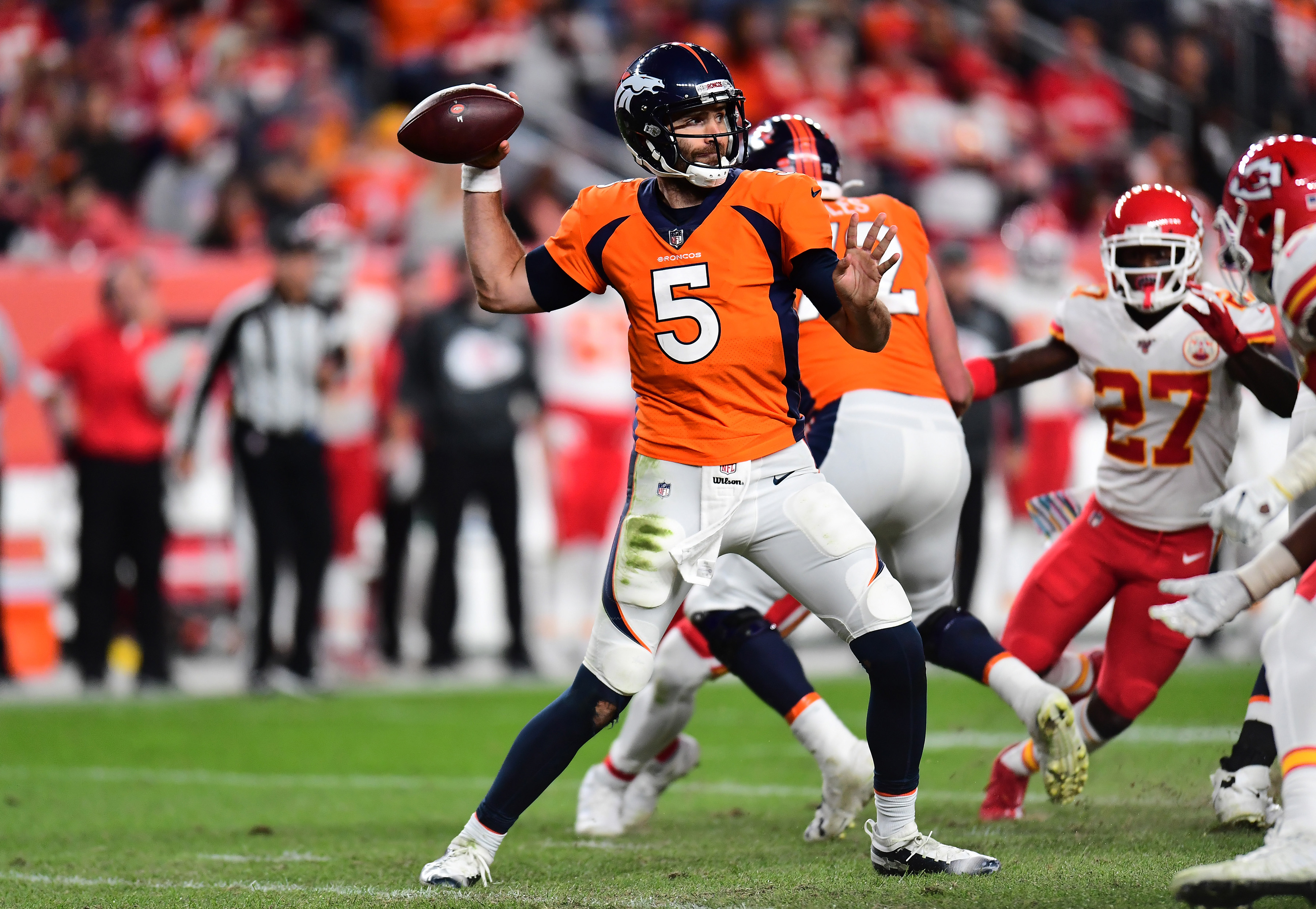 Oct 17, 2019; Denver, CO, USA; Denver Broncos quarterback Joe Flacco (5) prepares to pass in the second quarter against the Kansas City Chiefs at Empower Field at Mile High. Mandatory Credit: Ron Chenoy-USA TODAY Sports / Ron Chenoy