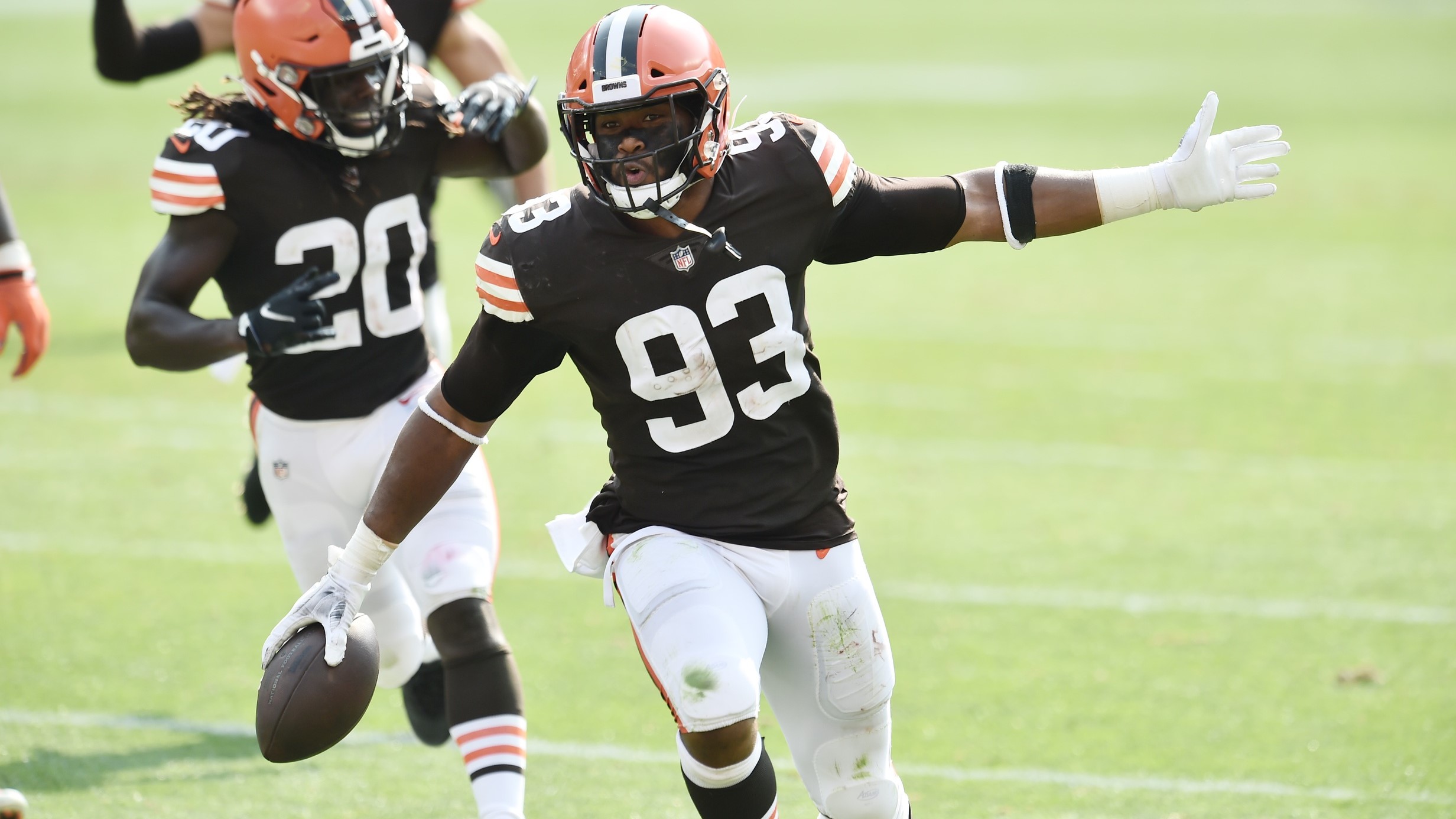 Sep 27, 2020; Cleveland, Ohio, USA; Cleveland Browns middle linebacker B.J. Goodson (93) and cornerback Tavierre Thomas (20) celebrate after Goodson intercepted a pass during the second half against the Washington Football Team at FirstEnergy Stadium / Ken Blaze-USA TODAY Sports