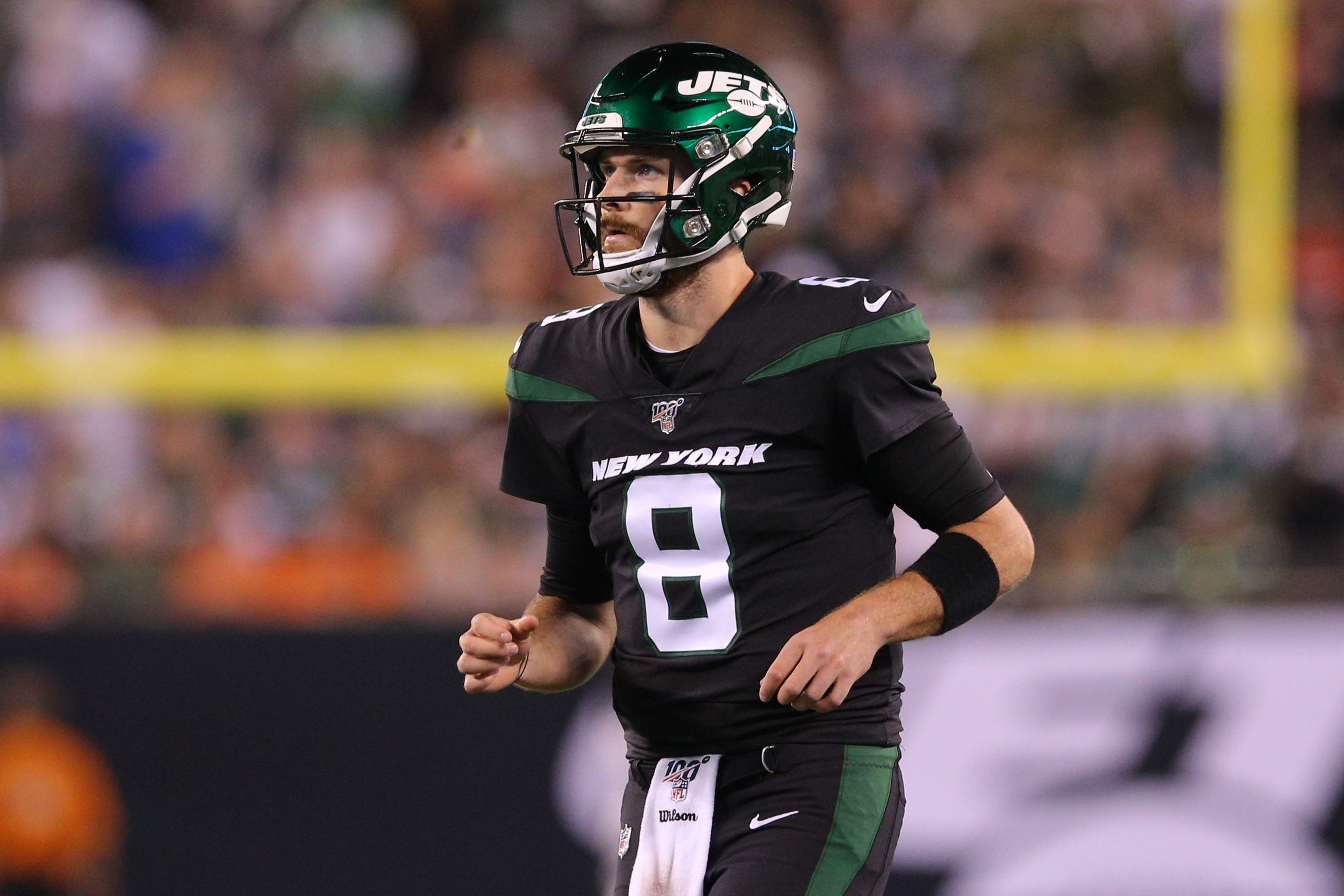 Sep 16, 2019; East Rutherford, NJ, USA; New York Jets quarterback Luke Falk (8) checks into the game against the Cleveland Browns during the second quarter at MetLife Stadium. Mandatory Credit: Brad Penner-USA TODAY Sportsundefined