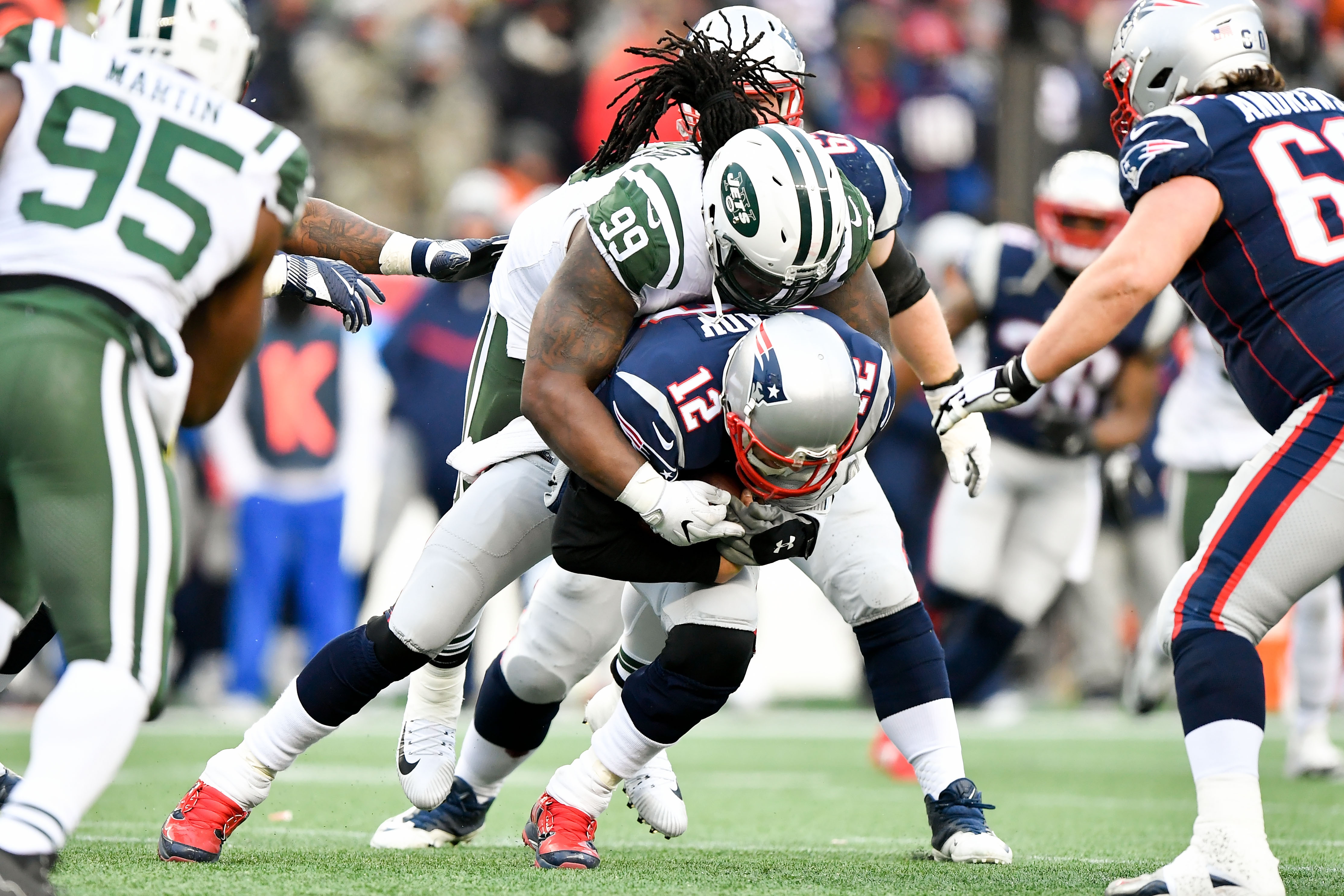 New England Patriots quarterback Tom Brady is sacked by New York Jets nose tackle Steve McLendon during the second half at Gillette Stadium. / Brian Fluharty/USA TODAY Sports