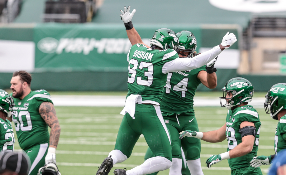 Oct 25, 2020; East Rutherford, New Jersey, USA; New York Jets outside linebacker Tarell Basham (93) celebrates his fumble recovery with linebacker Harvey Langi (44) against the Buffalo Bills during the first half at MetLife Stadium. Mandatory Credit: Vincent Carchietta-USA TODAY Sports / Vincent Carchietta-USA TODAY Sports