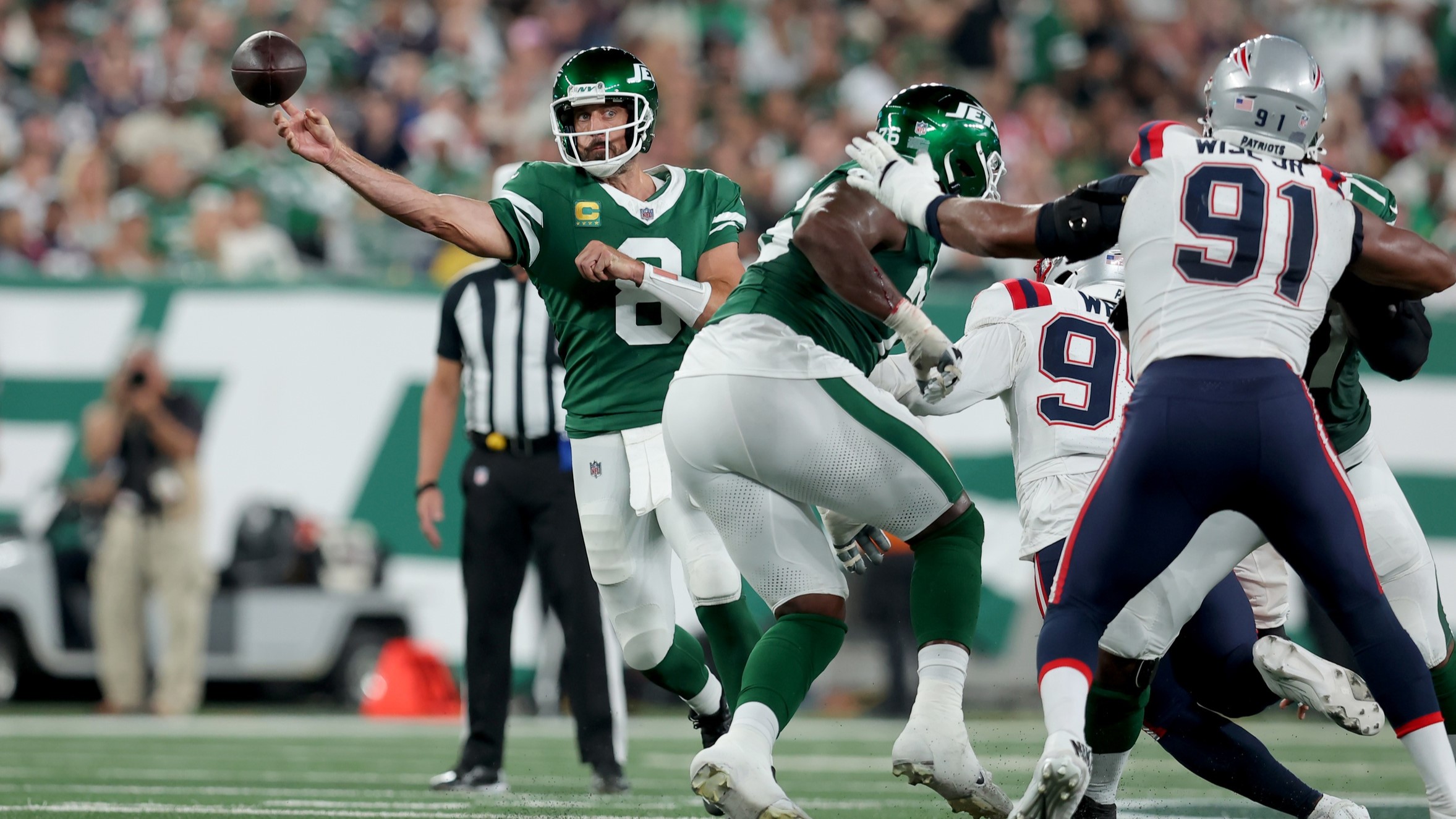 Sep 19, 2024; East Rutherford, New Jersey, USA; New York Jets head coach Robert Saleh hugs quarterback Aaron Rodgers (8) after a touchdown by running back Breece Hall (not pictured) during the second quarter against the New England Patriots at MetLife Stadium. / Brad Penner-Imagn Images