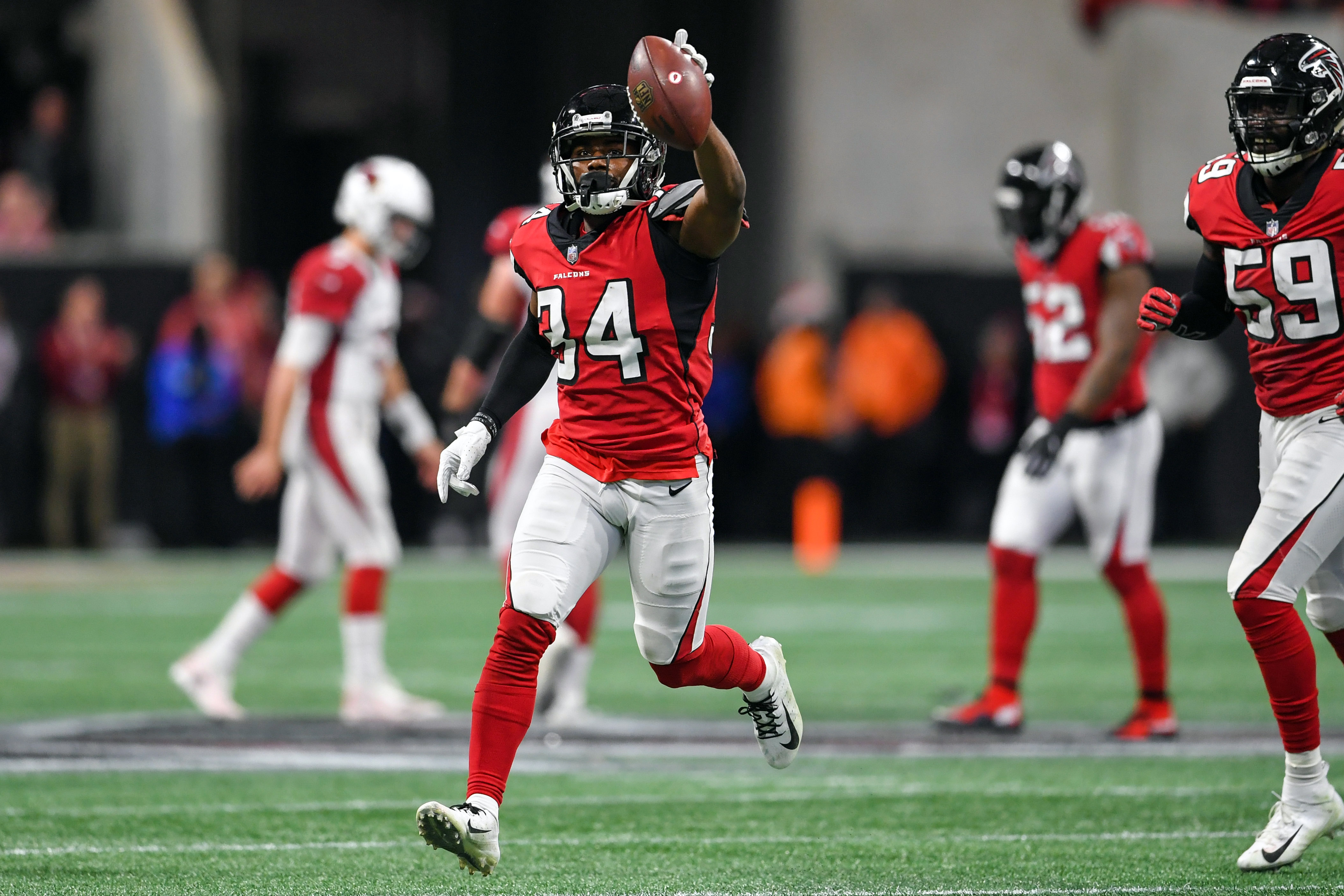 Dec 16, 2018; Atlanta, GA, USA; Atlanta Falcons cornerback Brian Poole (34) reacts after an interception against the Arizona Cardinals during the first half at Mercedes-Benz Stadium. Mandatory Credit: Dale Zanine-USA TODAY Sports / Dale Zanine