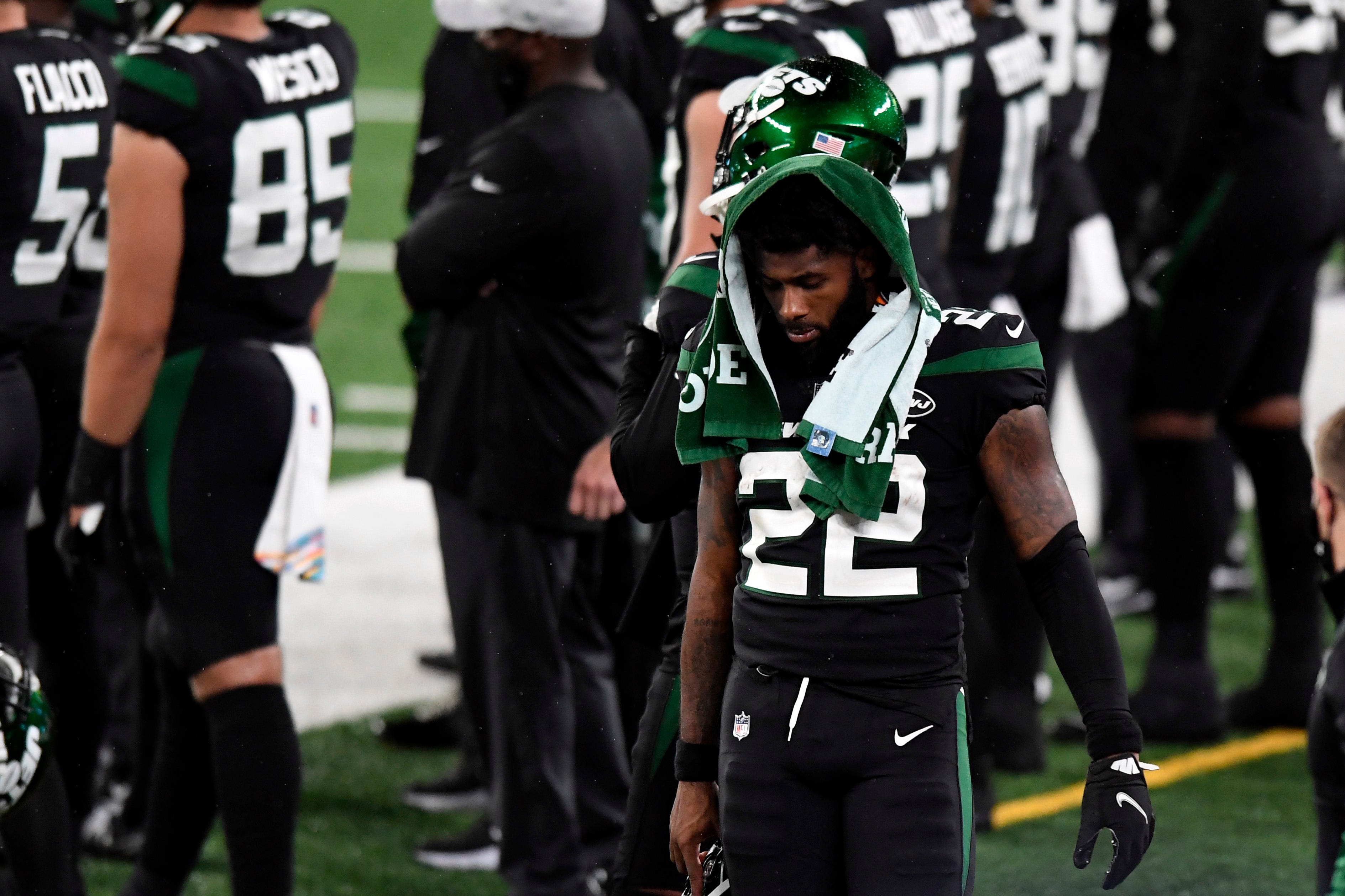 New York Jets running back La'Mical Perine (22) on the sideline as the game ends. The Jets lose to the Broncos, 37-28, at MetLife Stadium on Thursday, Oct. 1, 2020, in East Rutherford. Nfl Jets Broncos / Danielle Parhizkaran/NorthJersey.com via Imagn Content Services, LLC