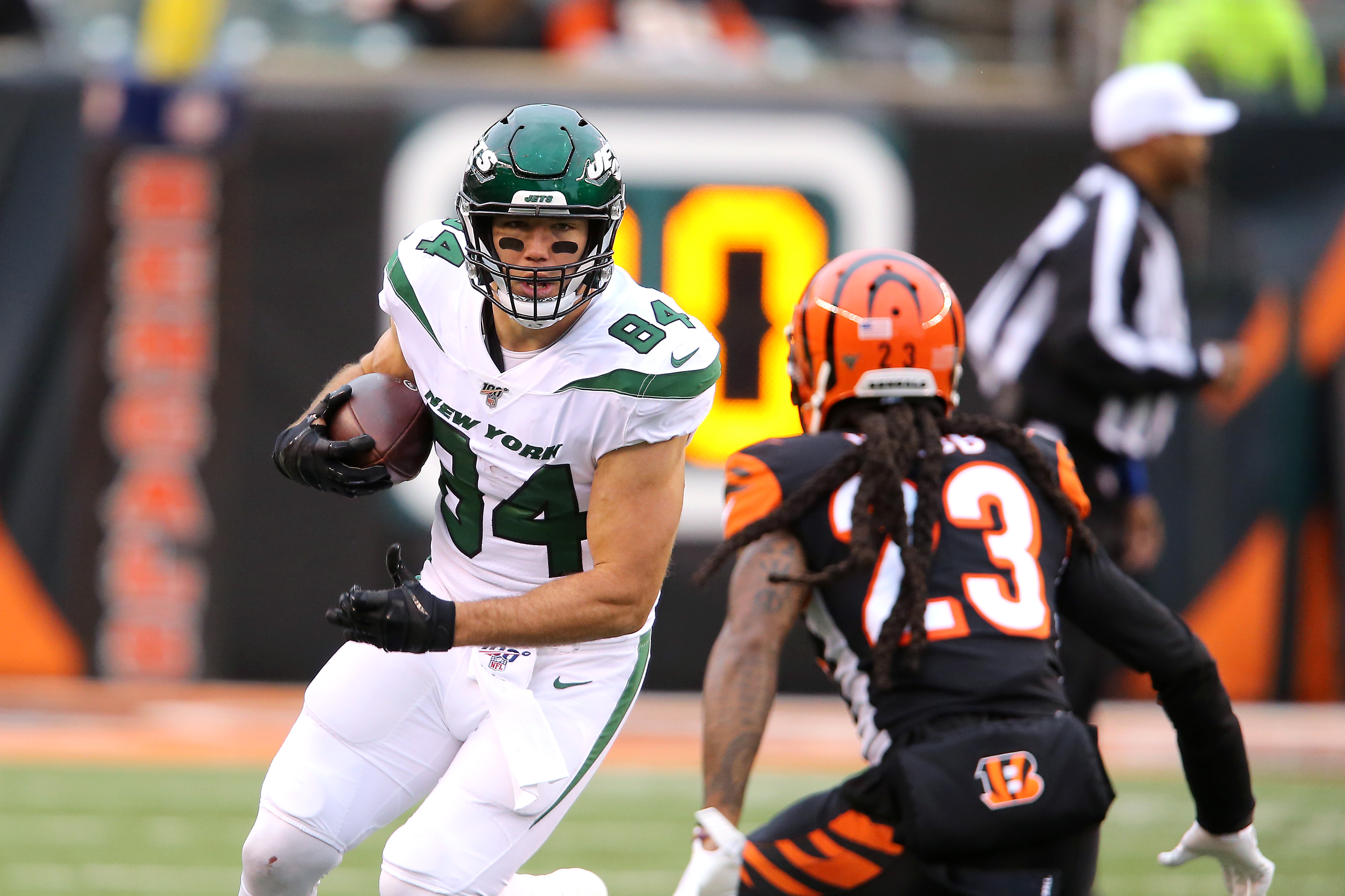 Dec 1, 2019; Cincinnati, OH, USA; New York Jets tight end Ryan Griffin (84) runs after catch as Cincinnati Bengals cornerback B.W. Webb (23) defends during the second quarter at Paul Brown Stadium. Mandatory Credit: Joe Maiorana-USA TODAY Sports / Joseph Maiorana