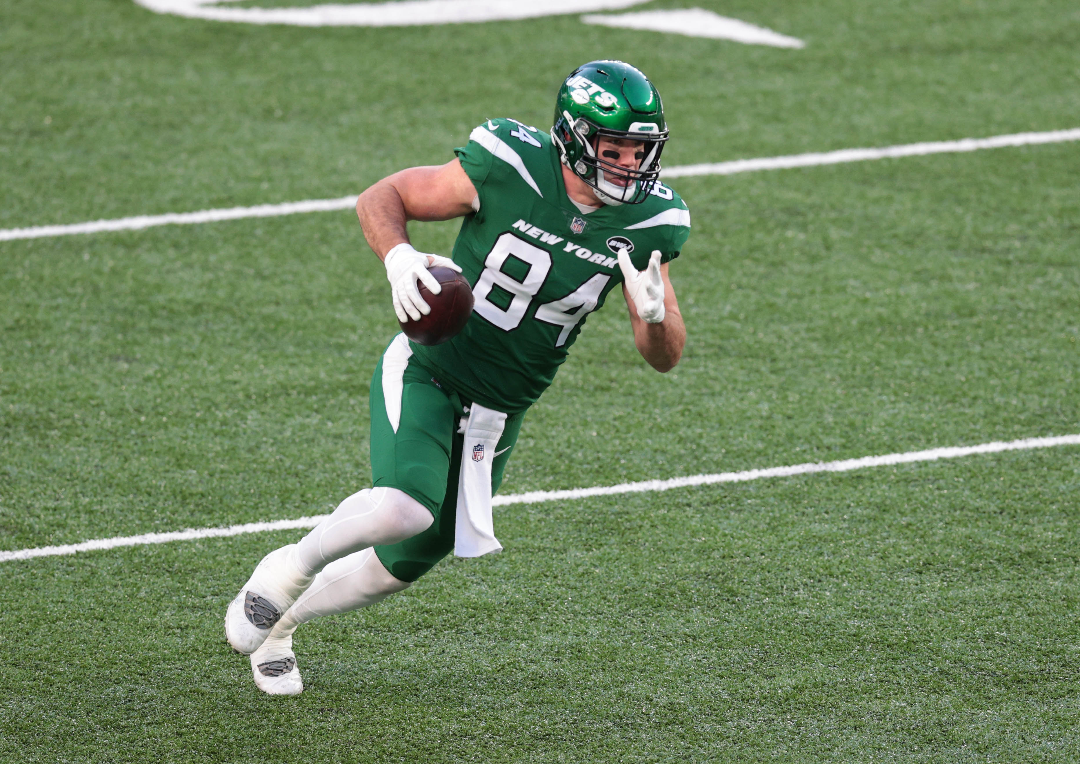 Dec 6, 2020; East Rutherford, NJ, USA; New York Jets tight end Ryan Griffin (84) runs the ball against the Las Vegas Raiders in the second half of a NFL game at MetLife Stadium. Mandatory Credit: Vincent Carchietta-USA TODAY Sports / Vincent Carchietta-USA TODAY Sports