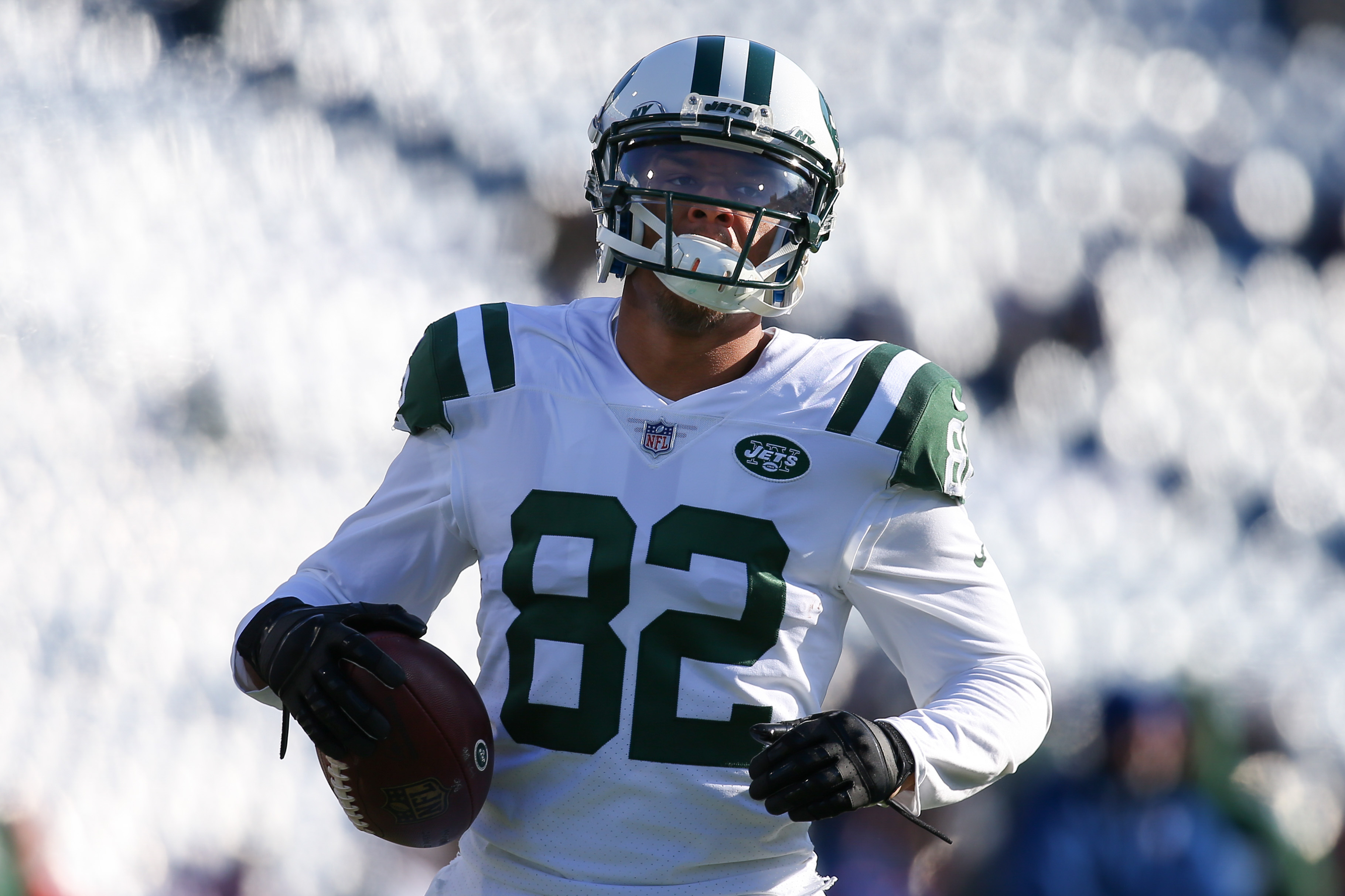 Dec 9, 2018; Orchard Park, NY, USA; New York Jets wide receiver Rishard Matthews (82) warms up prior to the game against the Buffalo Bills at New Era Field. Mandatory Credit: Rich Barnes-USA TODAY Sports / Rich Barnes