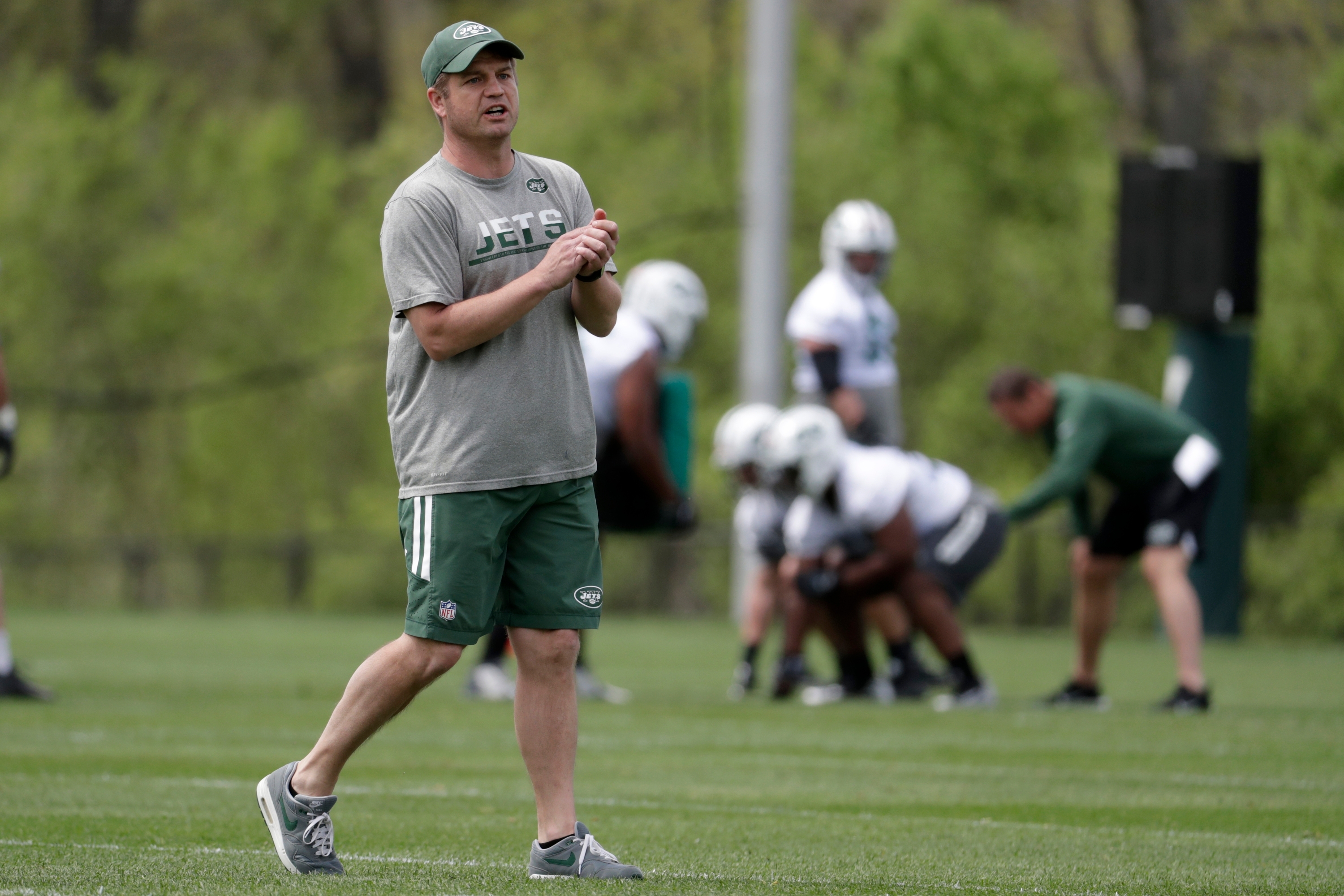 New York Jets offensive coordinator Jeremy Bates talks to his players during NFL rookie camp, Saturday, May 5, 2018, in Florham Park, N.J. (AP Photo/Julio Cortez) / Julio Cortez/AP