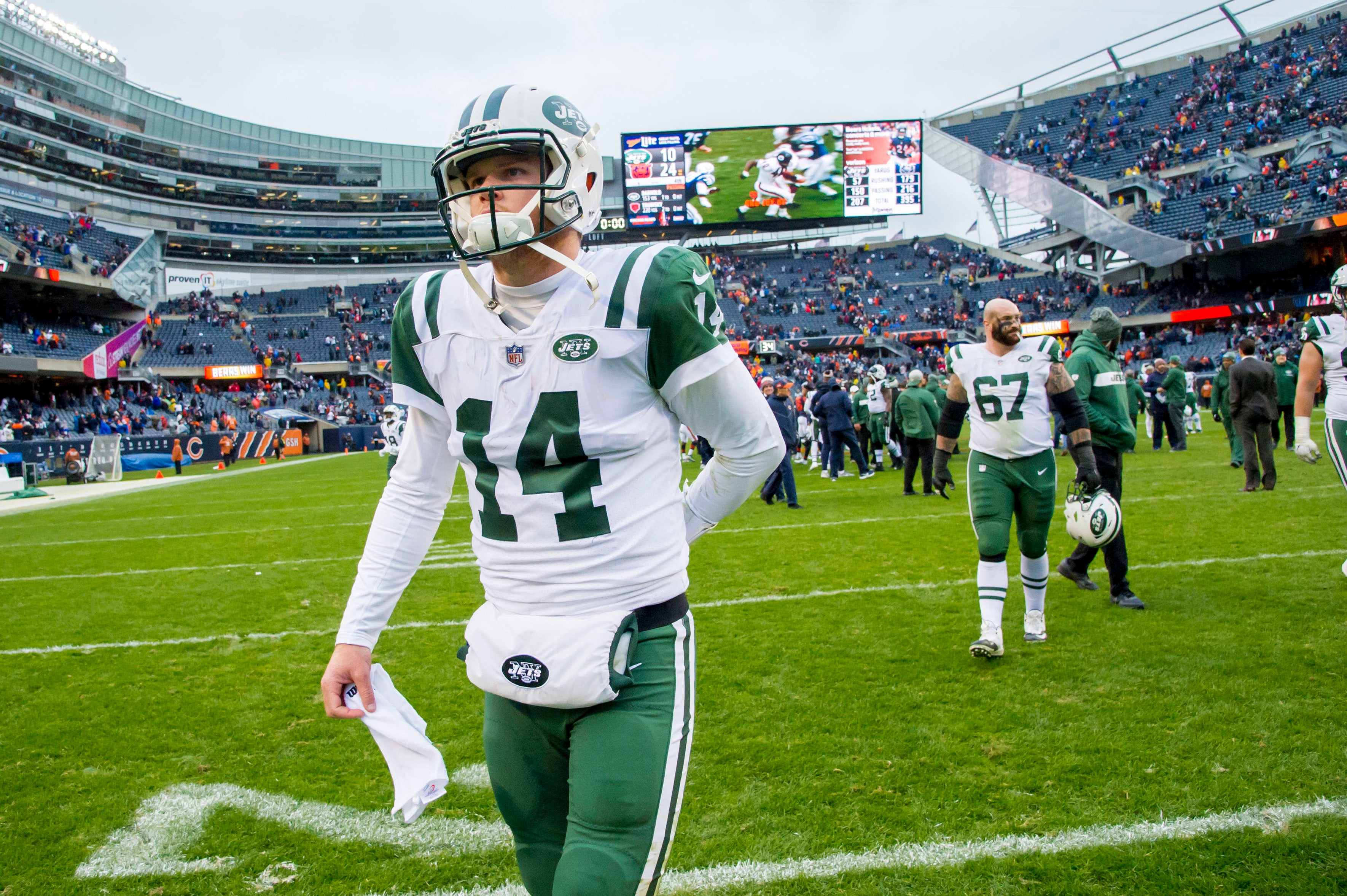 Oct 28, 2018; Chicago, IL, USA; New York Jets quarterback Sam Darnold (14) jogs off the field after the second half against the Chicago Bears at Soldier Field. Mandatory Credit: Patrick Gorski-USA TODAY Sports / Patrick Gorski