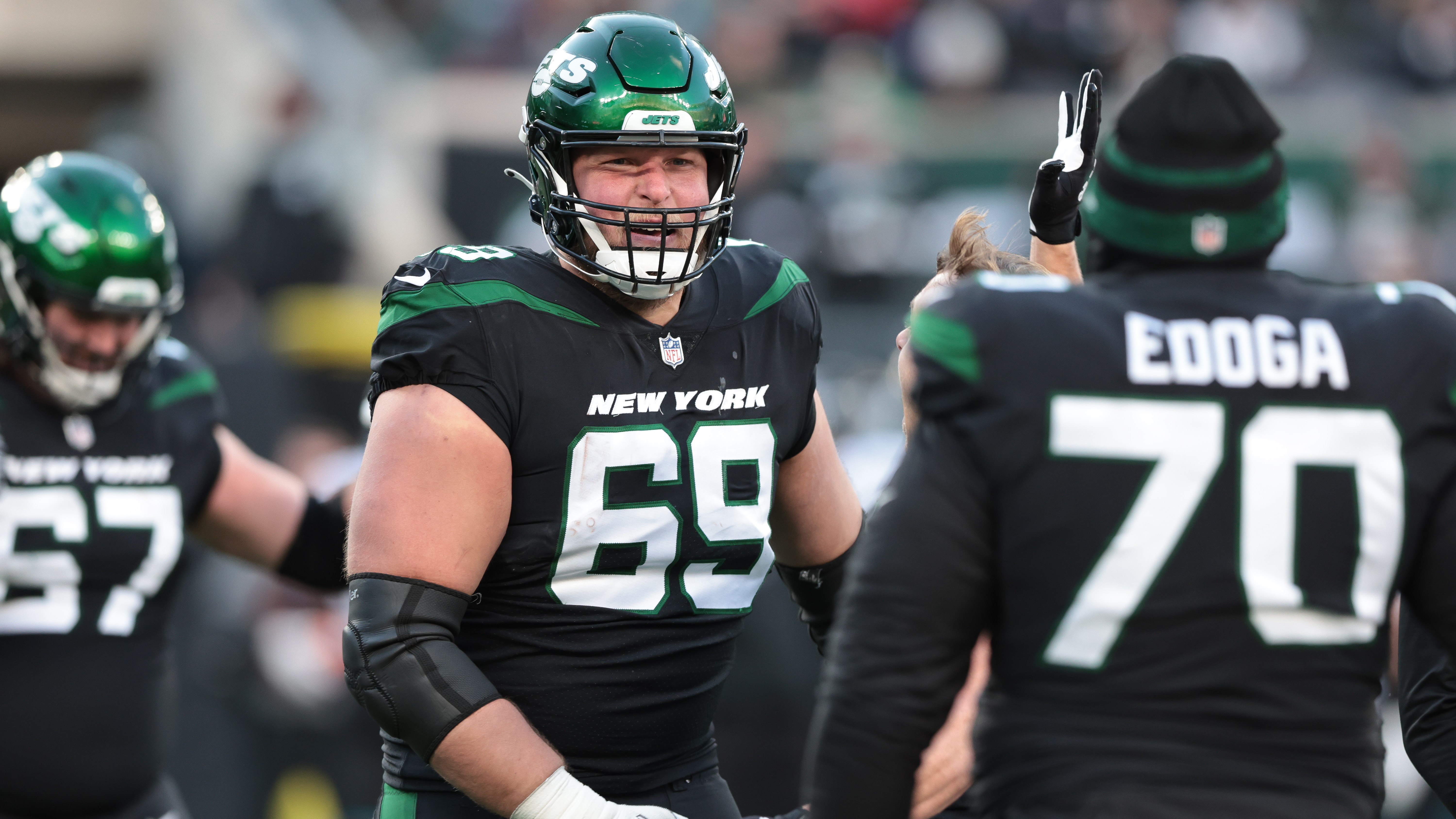 Dec 26, 2021; East Rutherford, New Jersey, USA; New York Jets offensive tackle Conor McDermott (69) celebrates his touchdown reception with teammates during the second half against the Jacksonville Jaguars at MetLife Stadium. / Vincent Carchietta-USA TODAY Sports