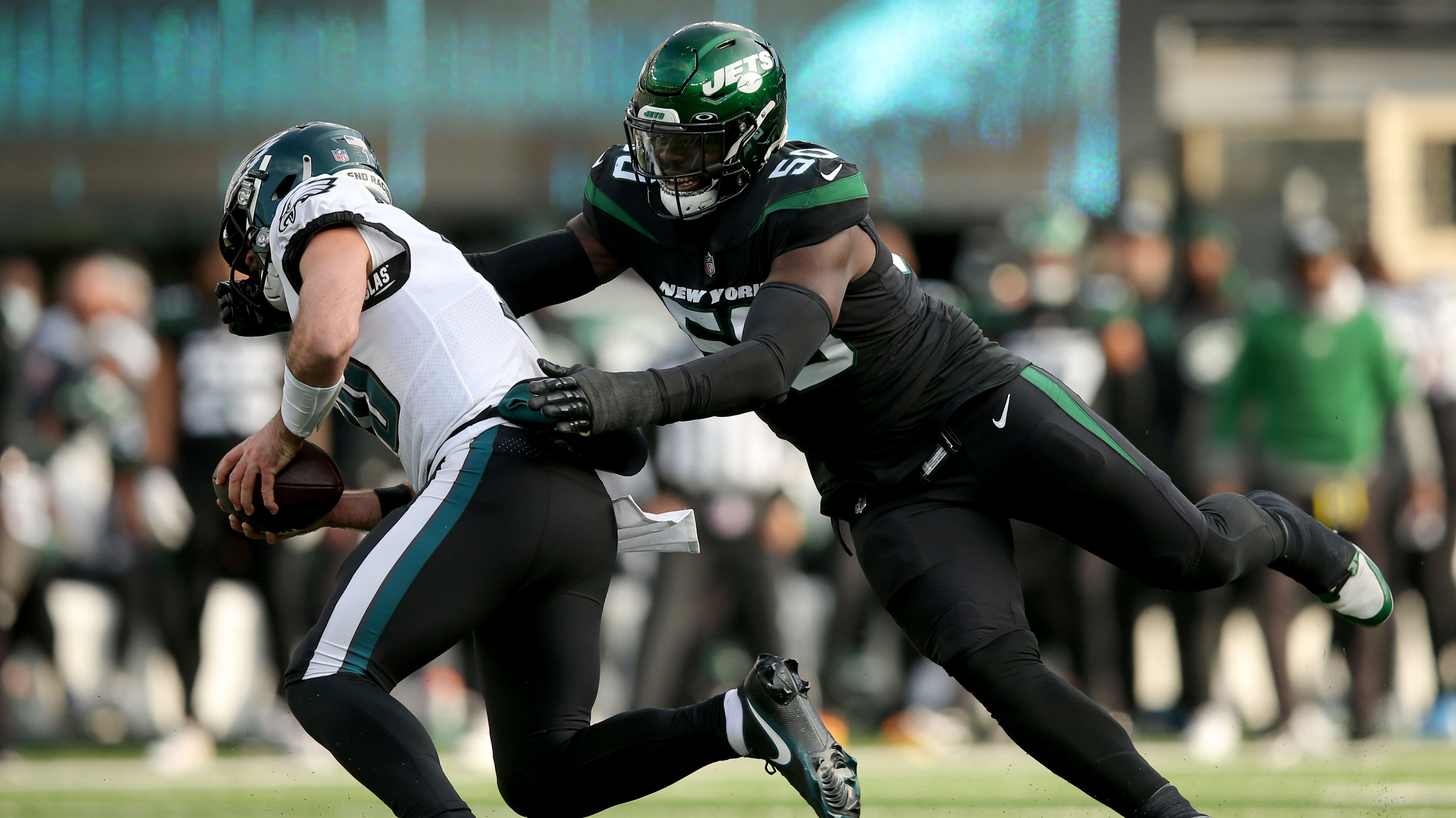 Dec 5, 2021; East Rutherford, New Jersey, USA; Philadelphia Eagles quarterback Gardner Minshew (10) is sacked by New York Jets defensive end Shaq Lawson (50) during the second quarter at MetLife Stadium. Lawson was called for a facemask penalty on the play. / Brad Penner-USA TODAY Sports