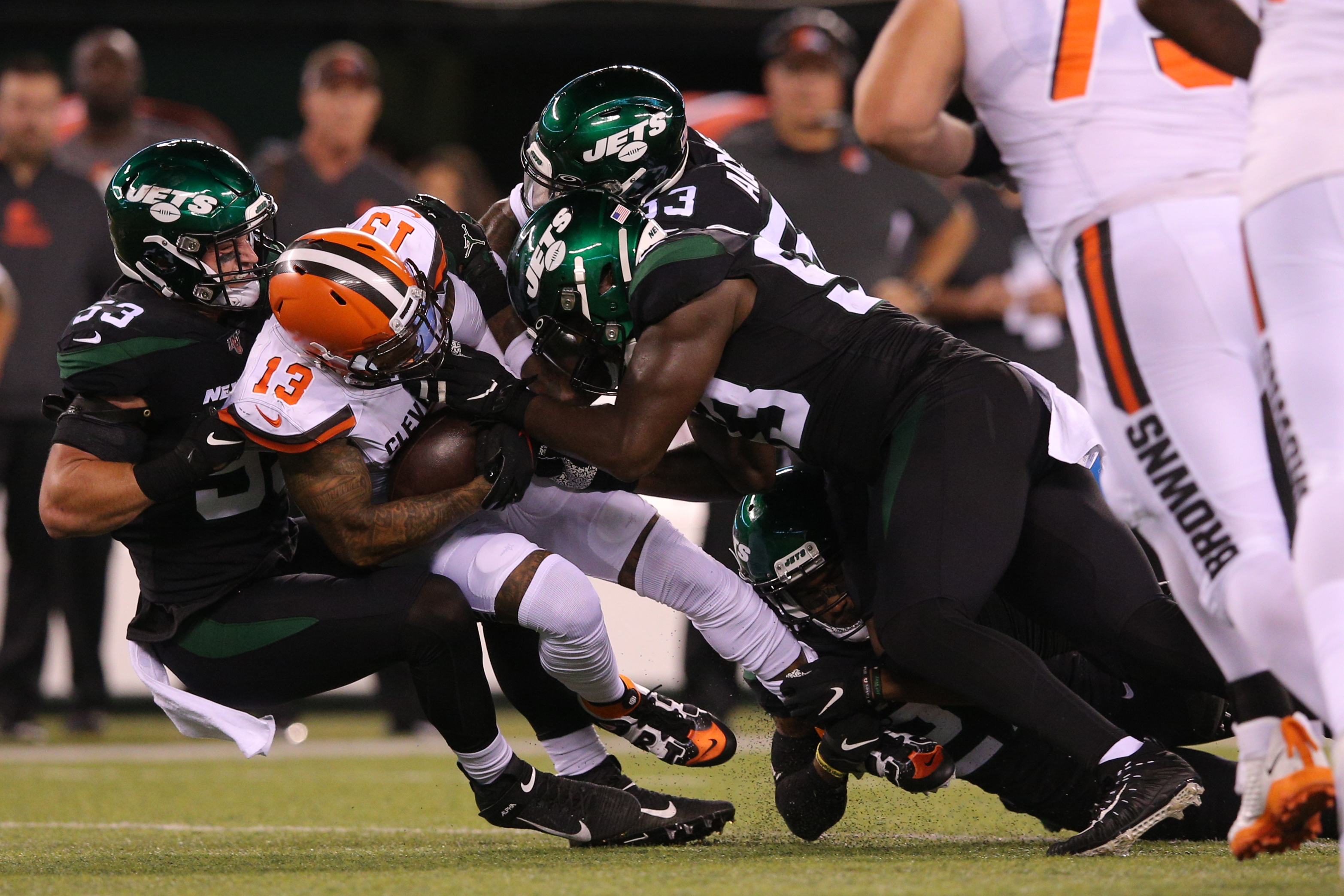 Sep 16, 2019; East Rutherford, NJ, USA; Cleveland Browns wide receiver Odell Beckham Jr. (13) is tackled by New York Jets linebacker Blake Cashman (53) and safety Jamal Adams (33) and defensive end Tarell Basham (93) during the first quarter at MetLife Stadium. Mandatory Credit: Brad Penner-USA TODAY Sportsundefined