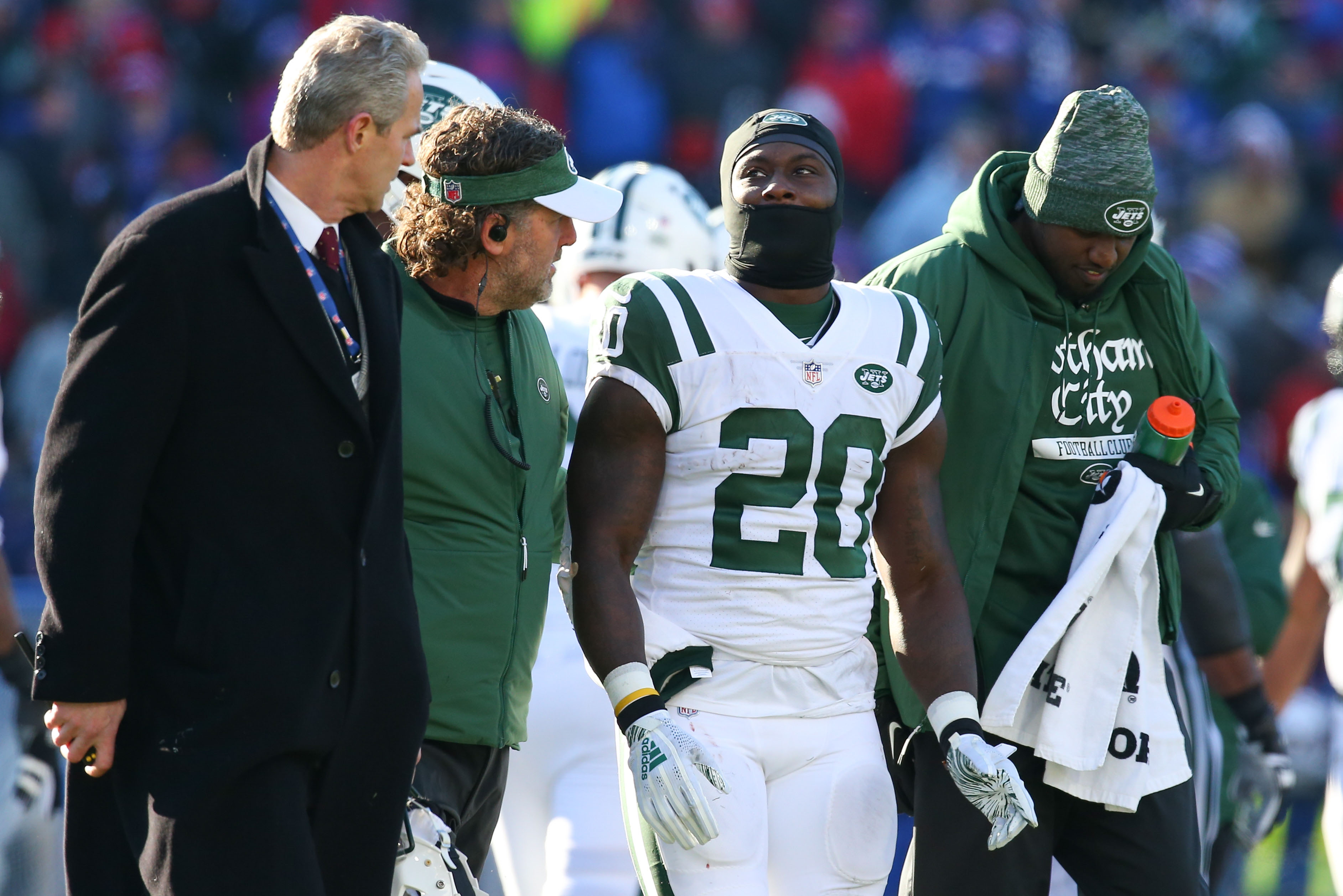 New York Jets running back Isaiah Crowell is escorted off the field after being injured against the Buffalo Bills during the first quarter at New Era Field. / Rich Barnes/USA TODAY Sports