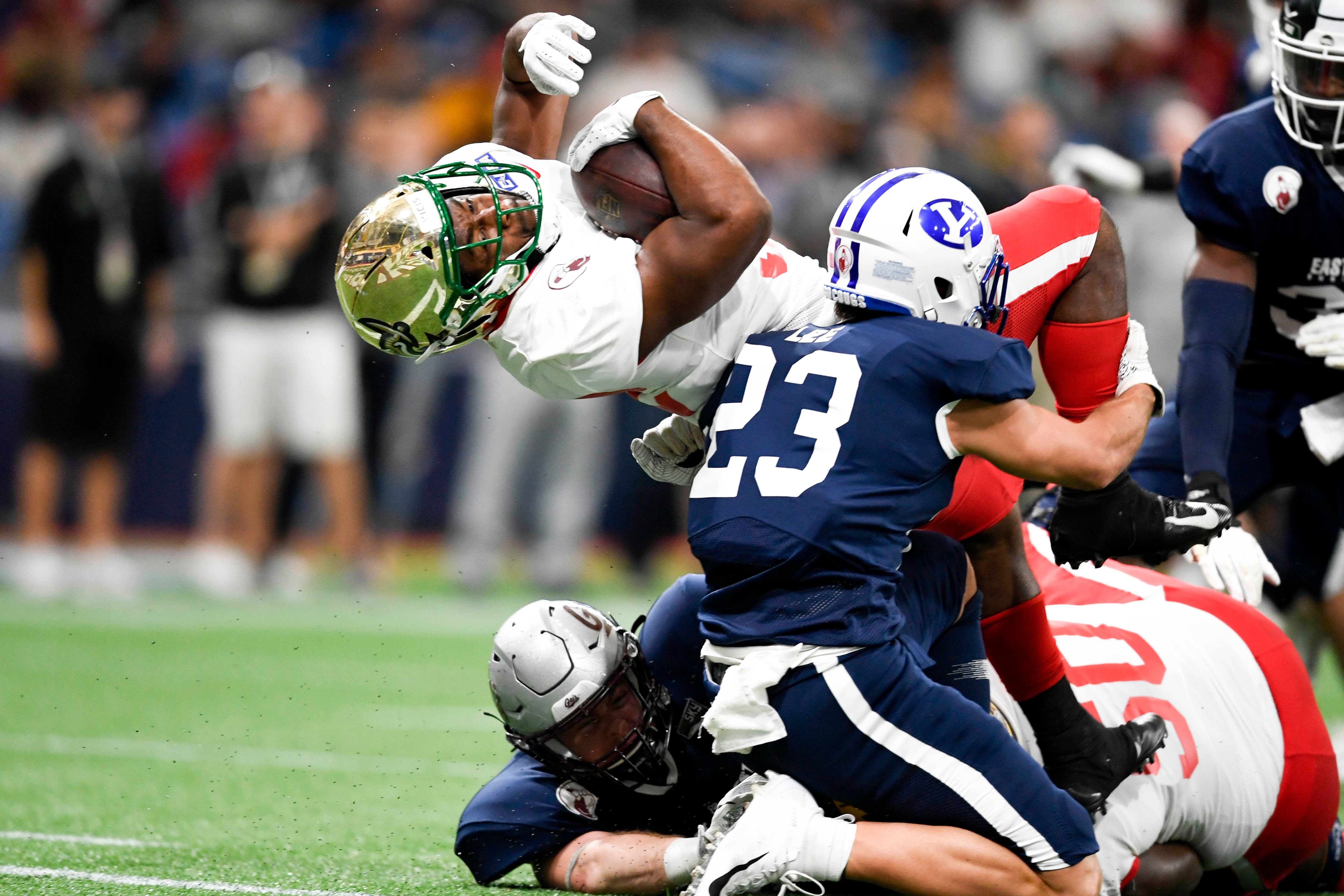 Jan 18, 2020; St. Petersburg, Florida, USA; Team East running back Benny LeMay (32) runs the ball in for a touchdown as Team West safety Austin Lee (23) defends during the first quarter at Tropicana Field. / Douglas DeFelice/USA Today SPORTS