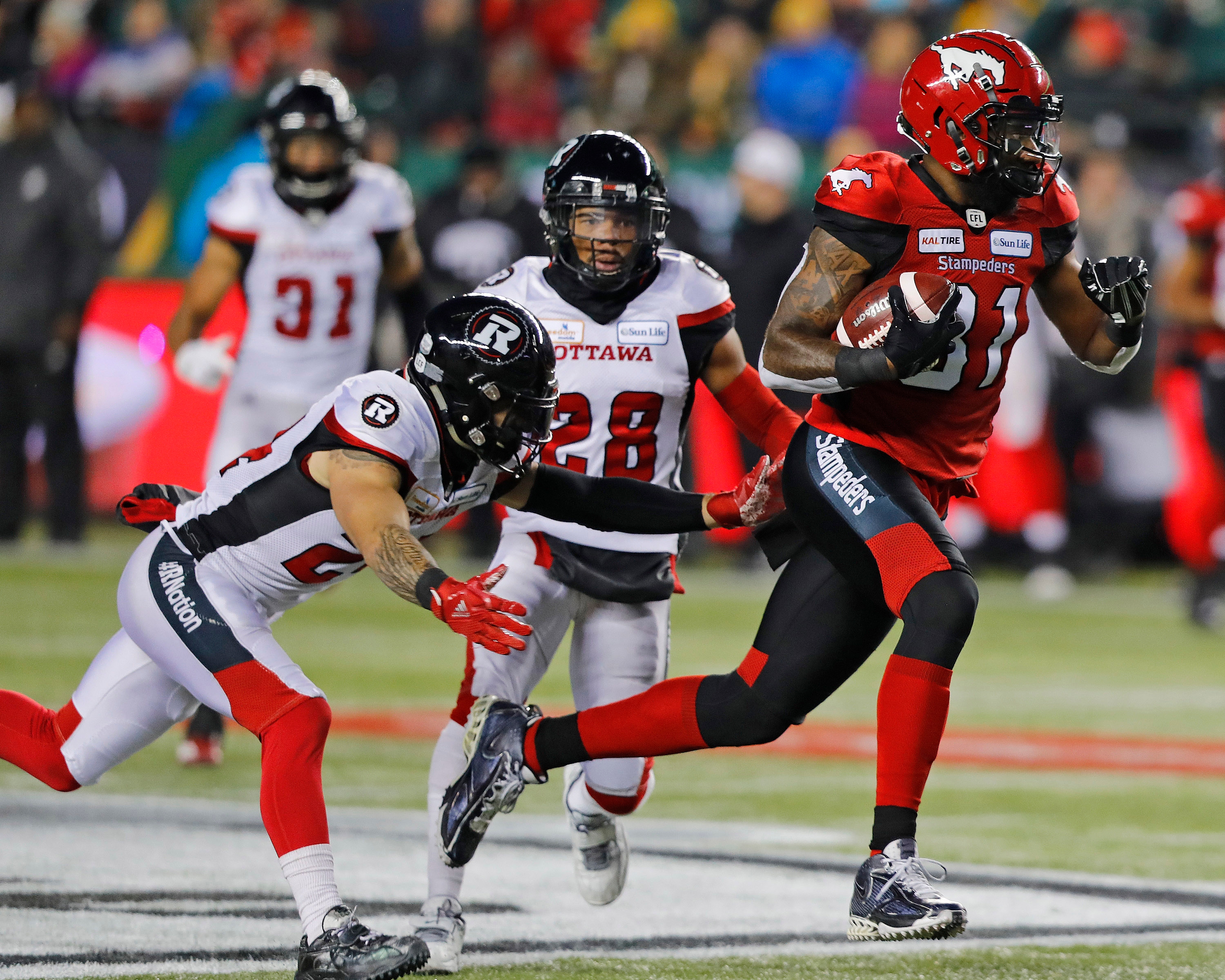 Nov 25, 2018; Edmonton, Alberta, CAN; Ottawa RedBlacks defensive back Anthony Cioffi (24) tries to catch Calgary Stampeders wide receiver Chris Matthews (81) during the 106th Grey Cup game at The Brick Field at Commonwealth Stadium. Mandatory Credit: Perry Nelson-USA TODAY Sports / Perry Nelson