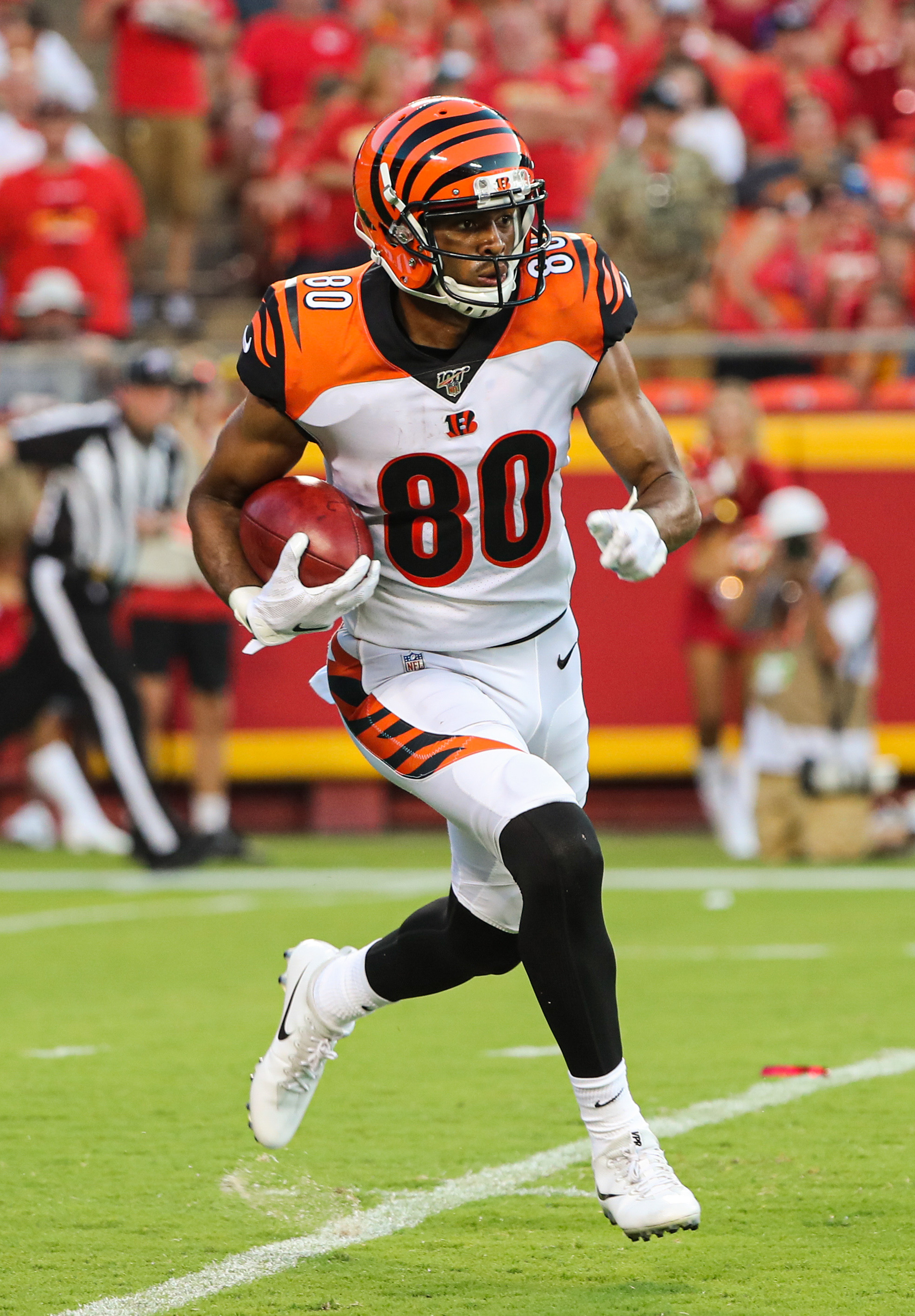 Aug 10, 2019; Kansas City, MO, USA; Cincinnati Bengals wide receiver Josh Malone (80) returns a kickoff against the Kansas City Chiefs during the first half at Arrowhead Stadium. Mandatory Credit: Jay Biggerstaff-USA TODAY Sports / Jay Biggerstaff