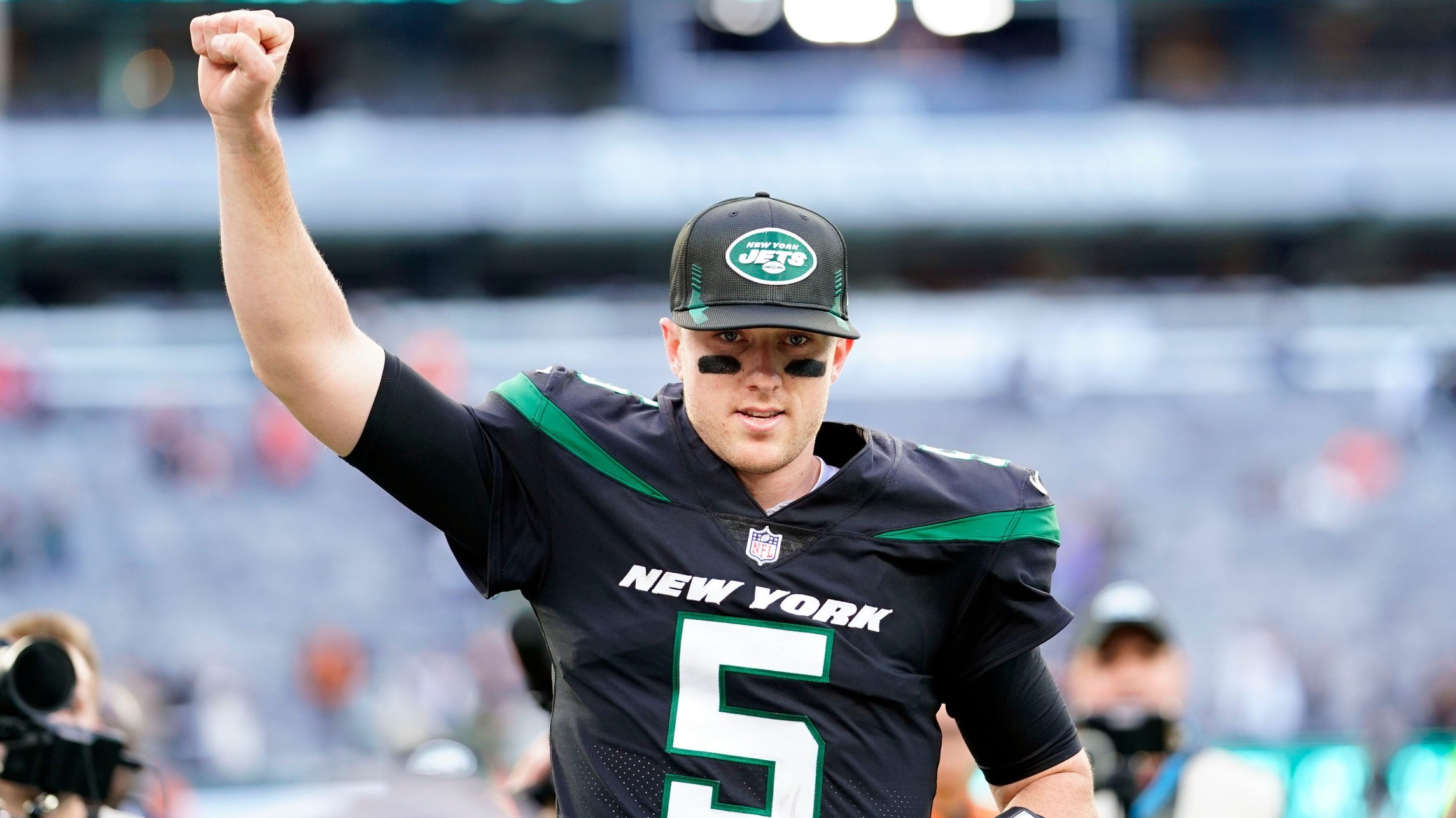 Caption: New York Jets quarterback Mike White (5) runs off the field with the game ball after defeating the Cincinnati Bengals, 34-31, at MetLife Stadium on Sunday, Oct. 31, 2021, in East Rutherford. / Danielle Parhizkaran/NorthJersey.com / USA TODAY NETWORK