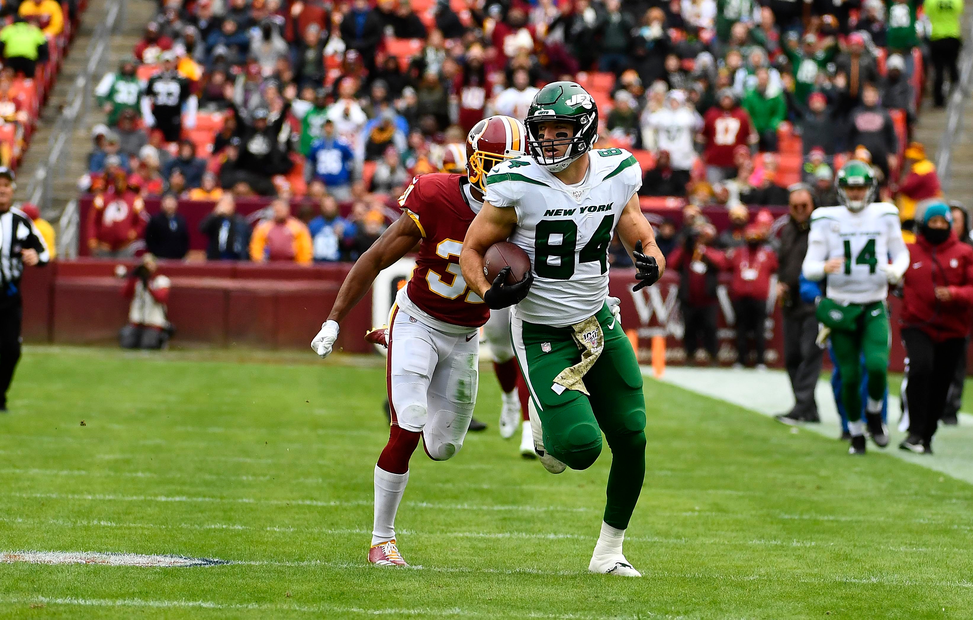 Nov 17, 2019; Landover, MD, USA; New York Jets tight end Ryan Griffin (84) runs after a catch against the Washington Redskins during the first half at FedExField. Mandatory Credit: Brad Mills-USA TODAY Sports / Brad Mills