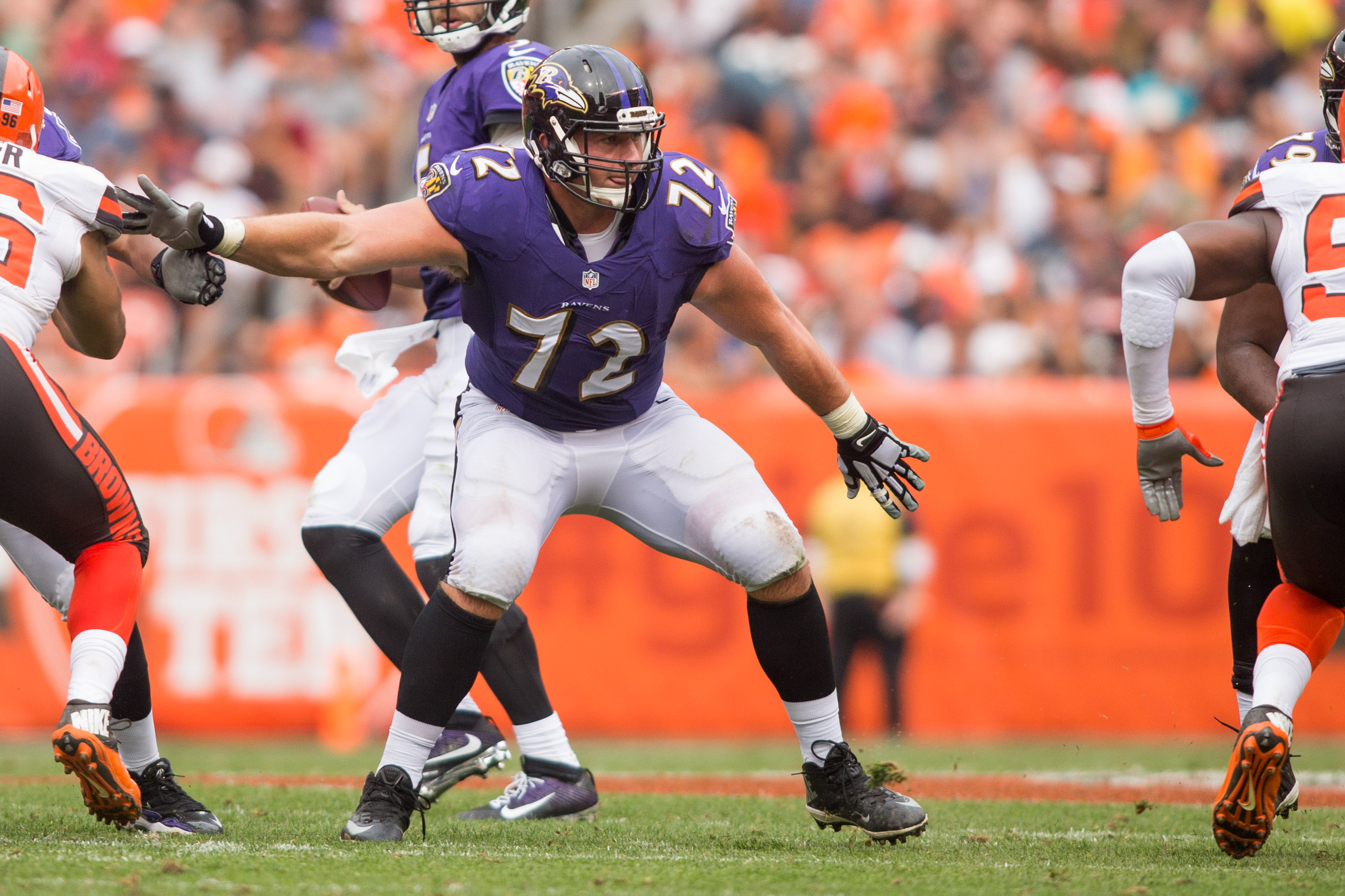 Sep 18, 2016; Cleveland, OH, USA; Baltimore Ravens offensive guard Alex Lewis (72) against the Cleveland Browns during the second half at FirstEnergy Stadium. The Ravens defeated the Browns 25-20. Mandatory Credit: Scott R. Galvin-USA TODAY Sports / Scott Galvin