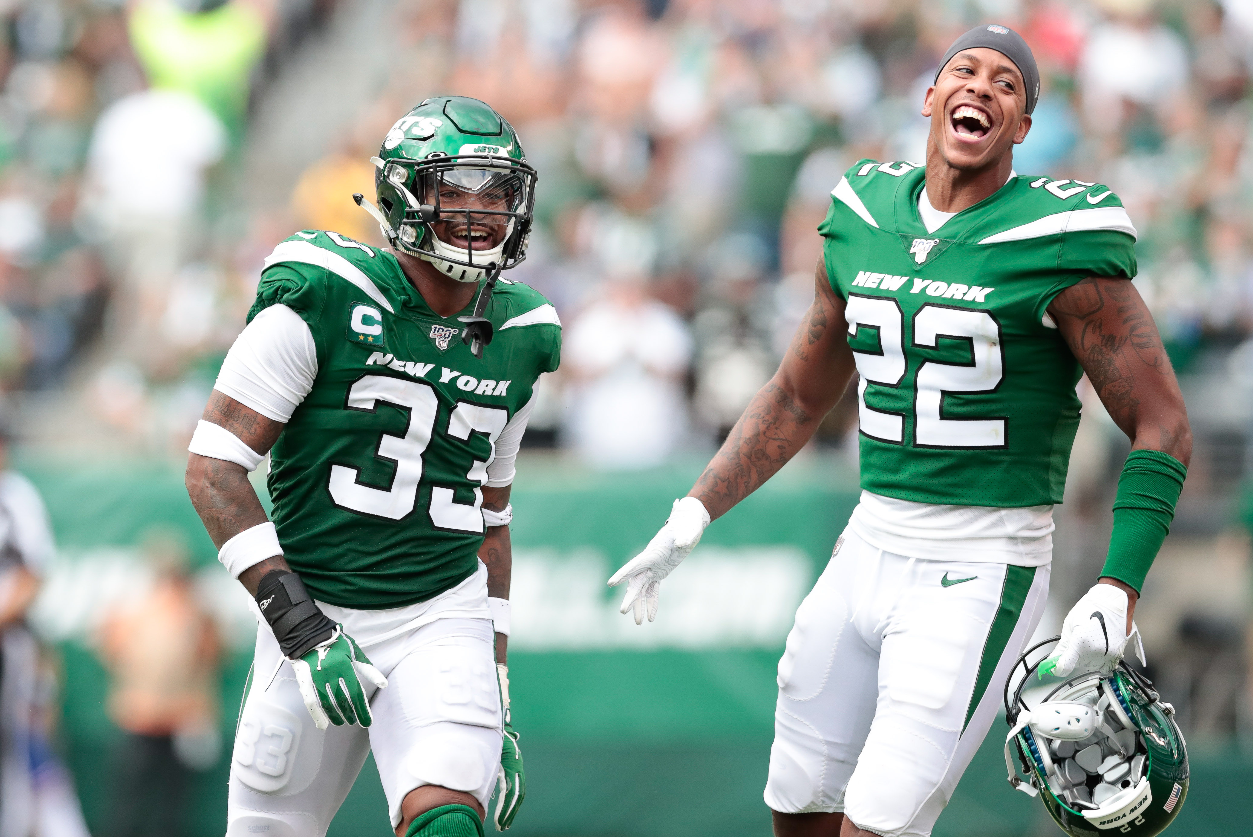 Sep 8, 2019; East Rutherford, NJ, USA; New York Jets strong safety Jamal Adams (33) and cornerback Trumaine Johnson (22) celebrate during the second half against the Buffalo Bills at MetLife Stadium. Mandatory Credit: Vincent Carchietta-USA TODAY Sports / Vincent Carchietta