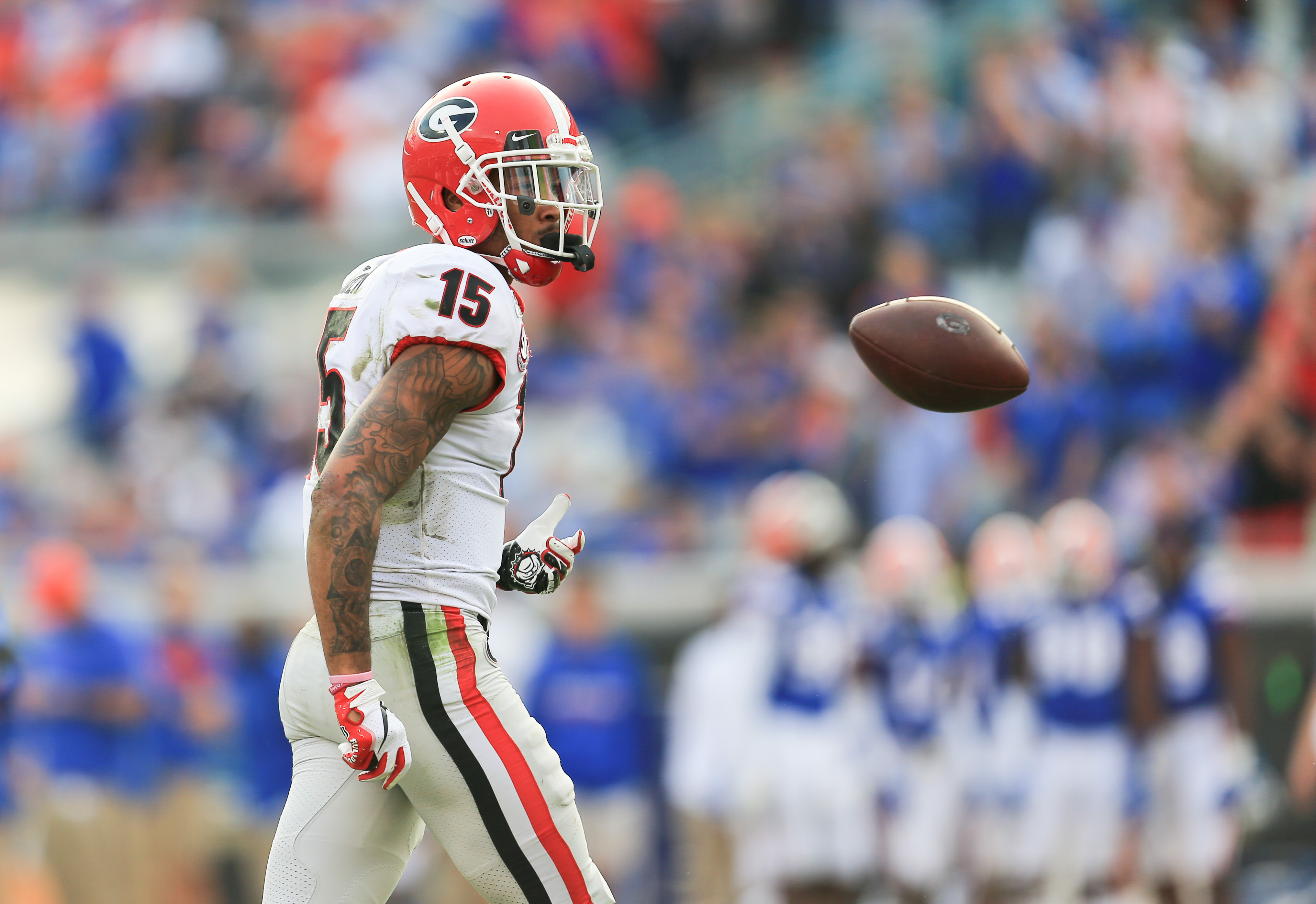 Nov 2, 2019; Jacksonville, FL, USA; Georgia Bulldogs wide receiver Lawrence Cager (15) flips the ball to a referee against the Florida Gators at TIAA Bank Field. Mandatory Credit: Matt Stamey-USA TODAY Sports / Matt Stamey